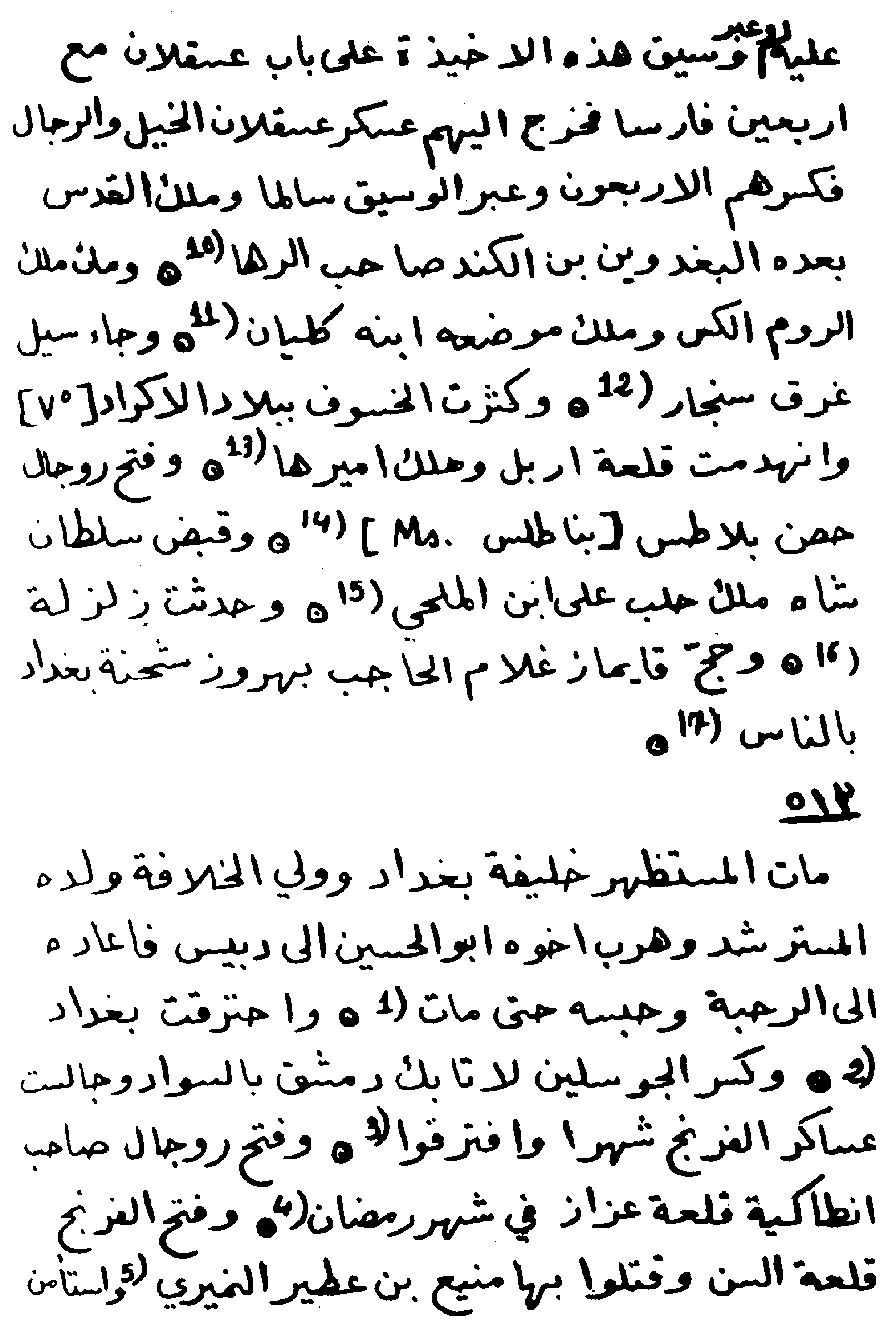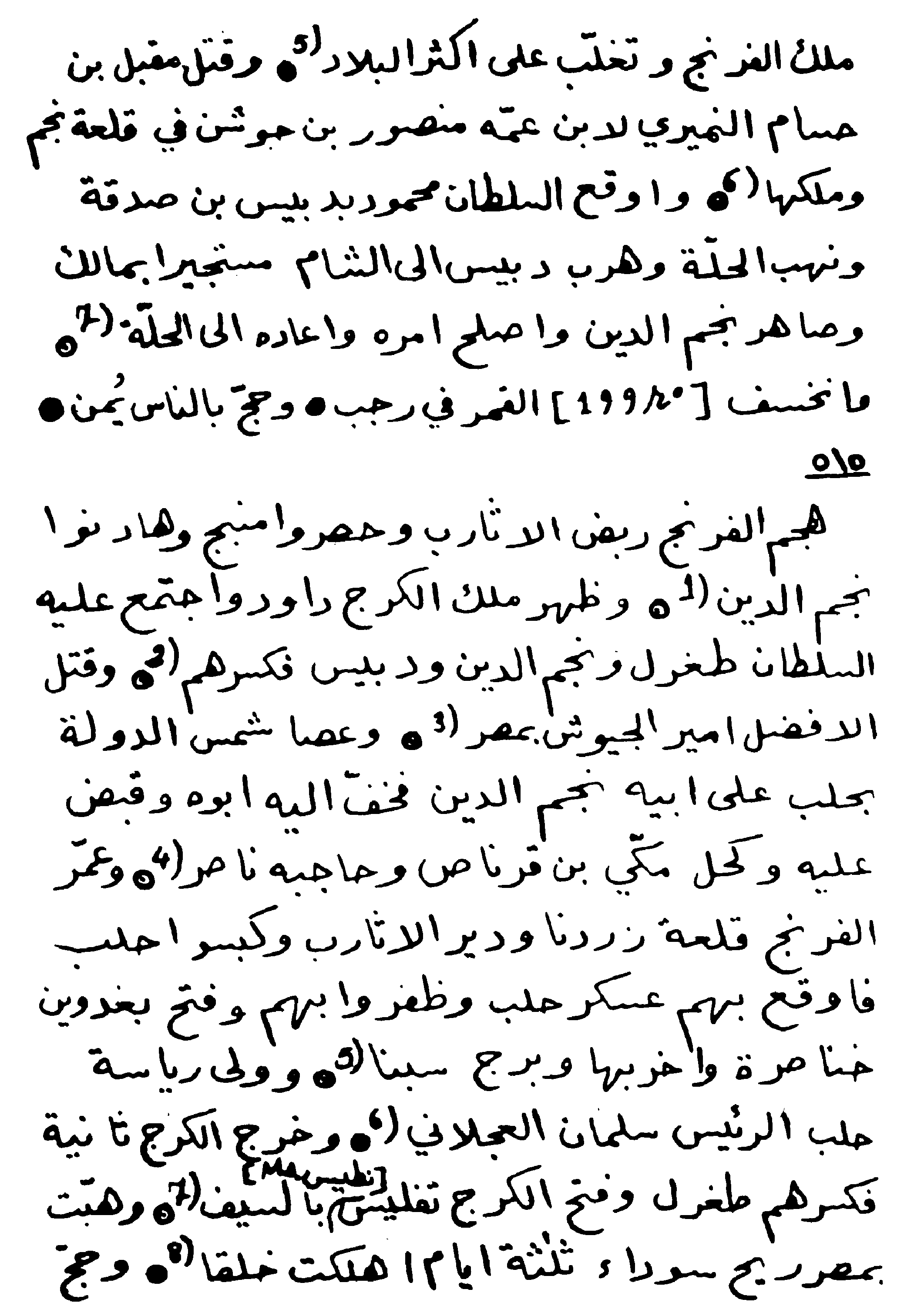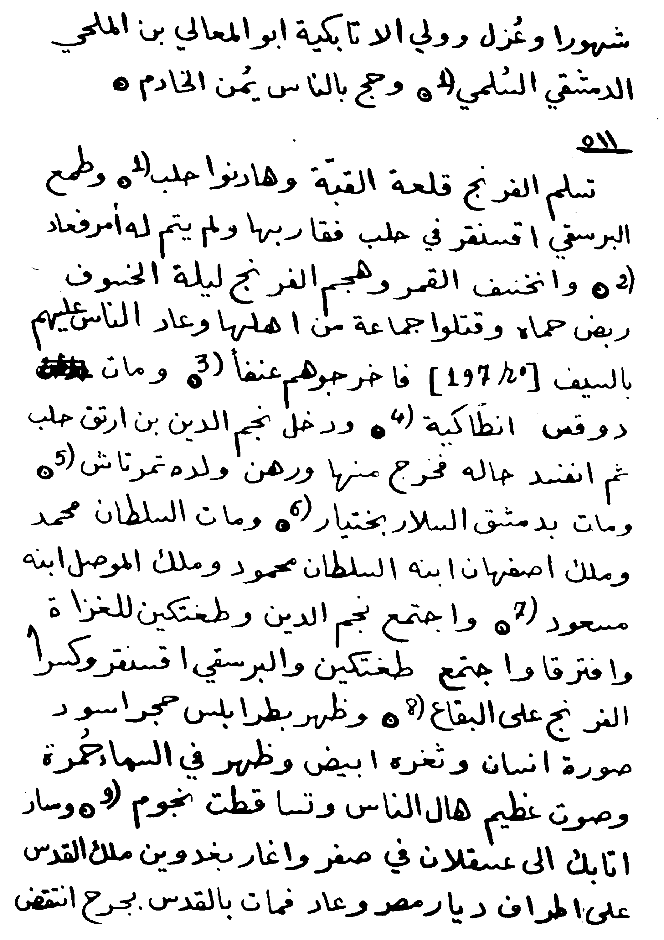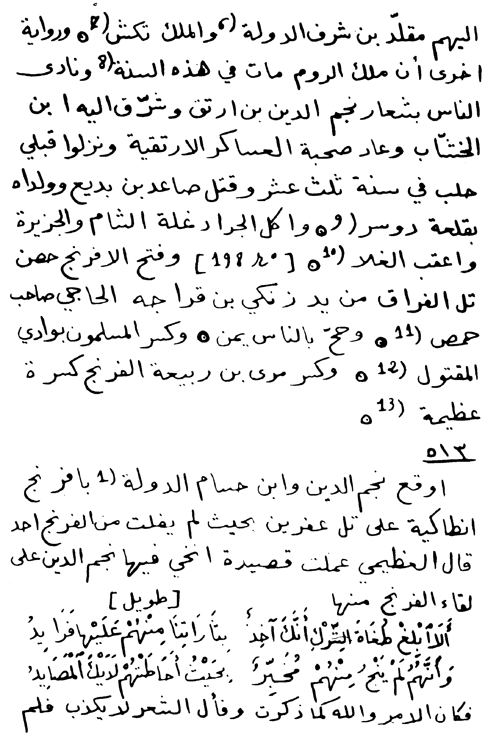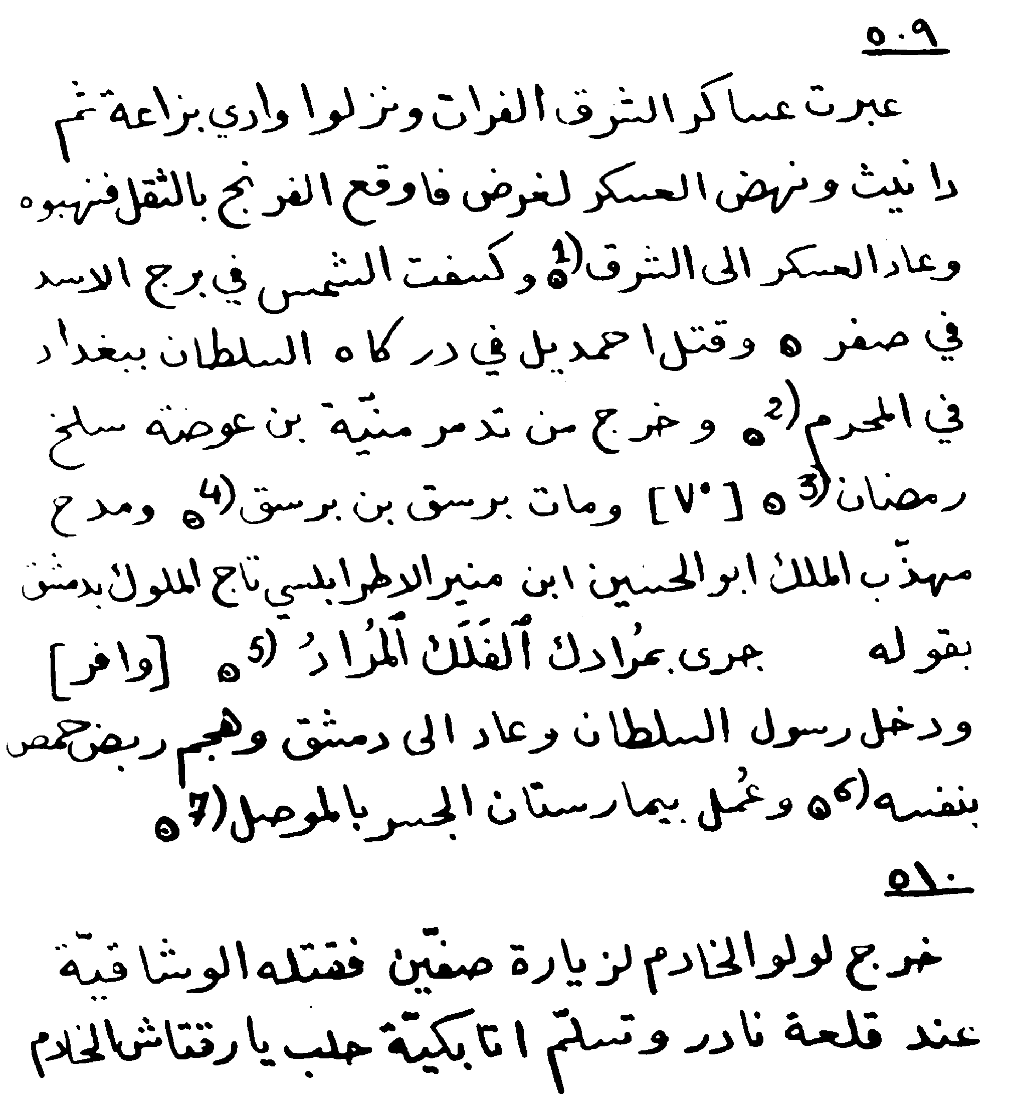 The eastern armies crossed the Euphrates, marching downward through Wadi Baz`ah and then (Tell) Danith3. As the troops rose up to handle a matter, firmly and without hesitation, the Franks4 attacked and plundered them. The army then returned to the east. The sun was eclipsed during the constellation of Leo in Safar5. Ahmadil was killed in the Sultan’s palace in Baghdad in Muharram6. Munyah Ibn Awda left Palmyra at the end of Ramadan. (70) Barsaq Ibn Barsaq7 died. And Muhadhdhab Al Malik Abu al-Husayn Ibn Munir al-Atrablusi8 praised Taj al-Muluk9 in Damascus, saying, "The desired sky has flown according to your will." [Wafir]10. And the Sultan's messenger had entered and returned to Damascus to attack the suburb of Homs himself. And the Al-Jisr hospital (or as in the original text Bimaristan11) was built in Mosul.