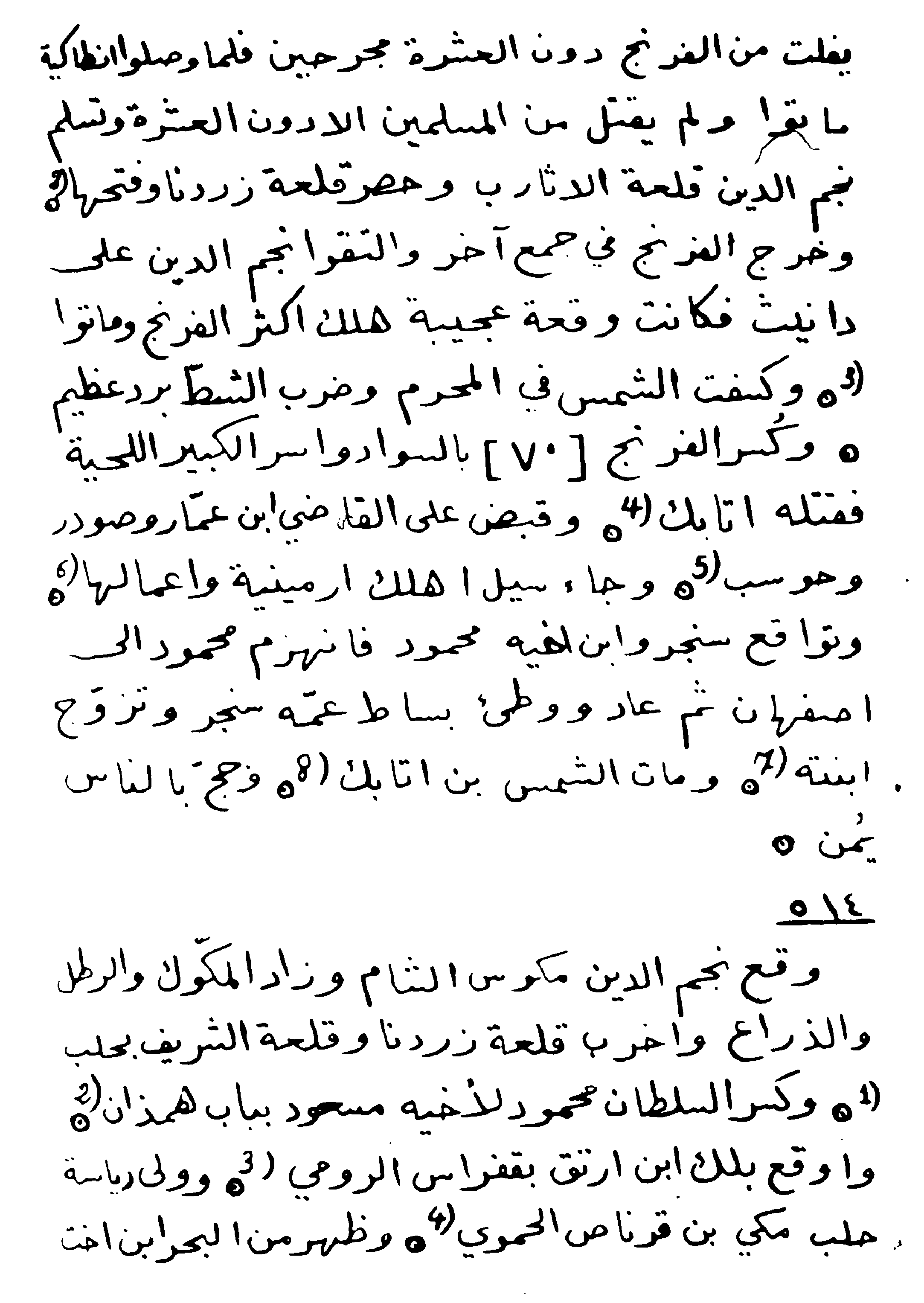 Al-Mustazhir, Caliph of Baghdad, died and his son Al-Mustarshdir too. Whose brother Abu Al- Hussein had fled to Dubays, and was later returned to Al-Rahba and imprisoned until his death. Baghdad was burned down. The Joscelin Atabeg defeated Damascus with a troop. Which had stayed with the Frankish armies for a month before diverging paths. Rojal, the ruler of Antakya, conquered the fortress of Azaz during the month of Ramadan. The Franks conquered the fortress of Al-Sun, in which they managed to kill Mani’ bin Atir Al-Numayri. Before Muqallid bin Sharaf Al-Dawla and King Takash had sought their protection. Another account states that the Roman king died in this year. The people chanted a slogan in the name of Najm Al-Din bin Artuq, which moved Ibn Al-Khashshab to long for him. He then returned with the Artuqid armies and descended to the south of Aleppo in the year thirteen. Sa’id bin Badi’ and his two sons were killed in the fortress of Dosar. Swarms of locusts devoured the crops of Sham and the Arabian Peninsula, resulted in inflation. The Franks conquered the fortress of Tell al-Firaq, taking it from the hands of Zengi bin Qarajah al-Hajji, the ruler of Homs. Leading people on to Yemen. The Muslims were defeated in Wadi al-Maqtul. Mari bin Rabi’ah defeated the Franks in a glorious battle.