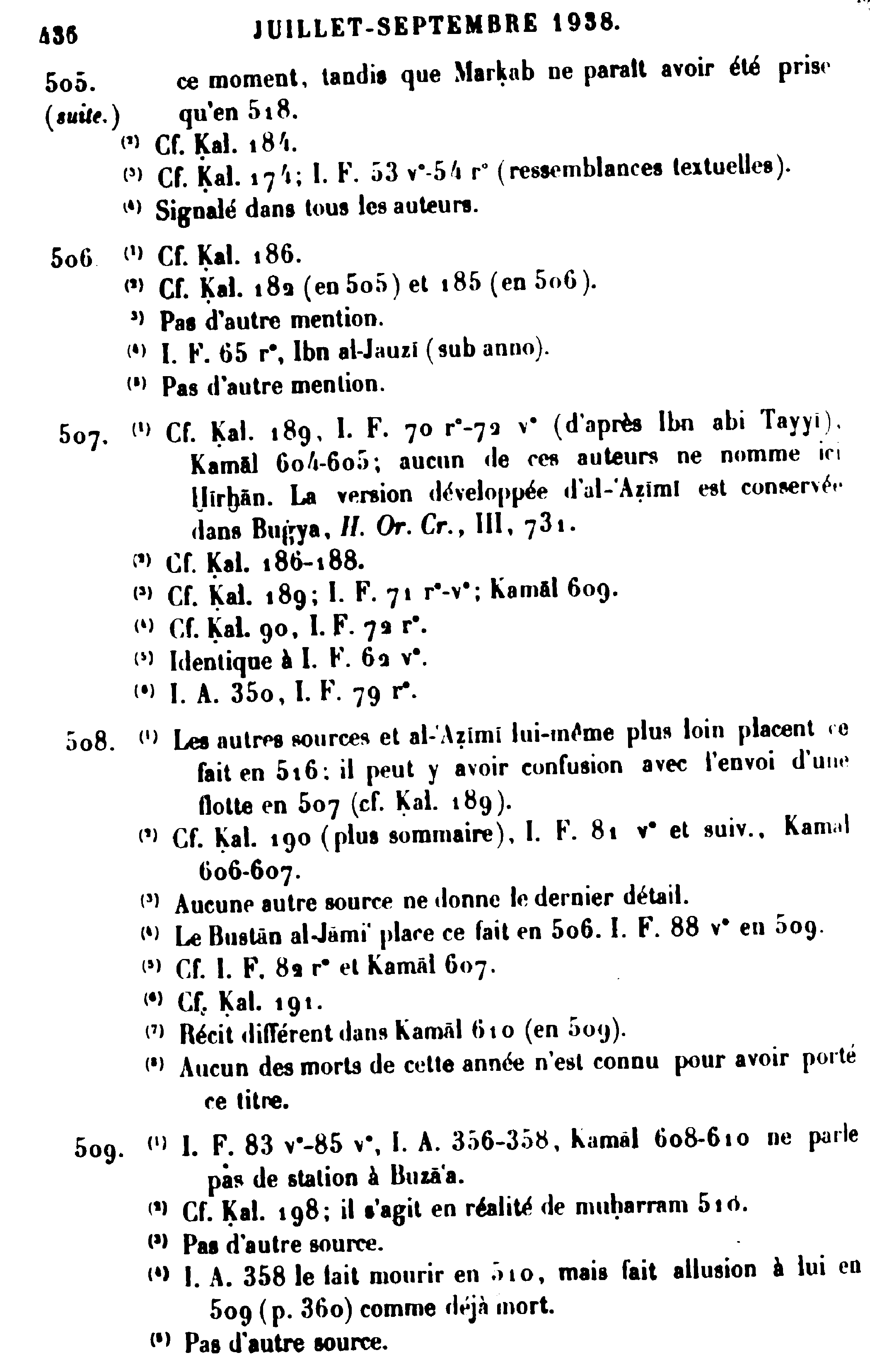 8 None of the dead of this year are known to have borne this title.French1 Les autres sources et al-'Azimi lui-même plus loin placent ce fait en 516: il peut y avoir confusion avec l'envoi d'une flotte en 507 (cf. Kal. 189).