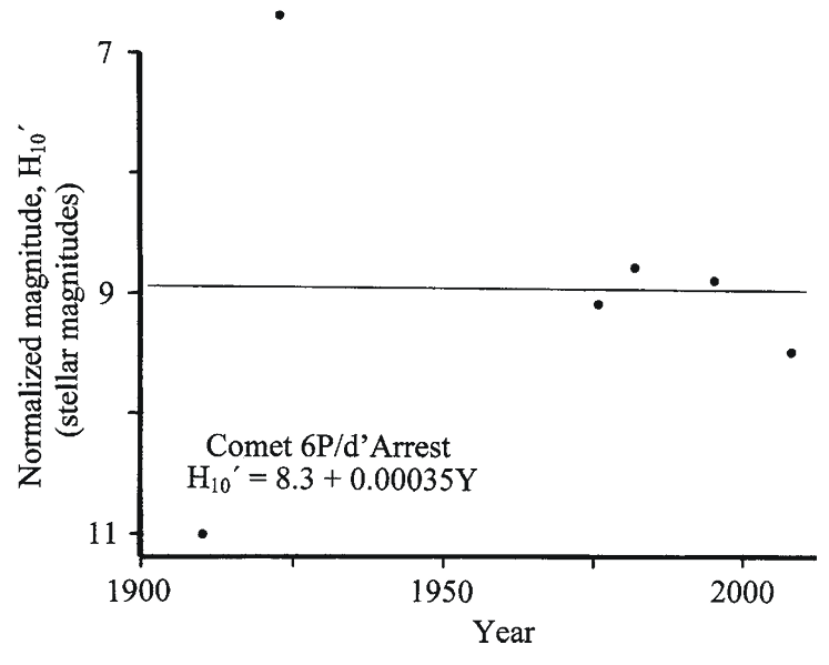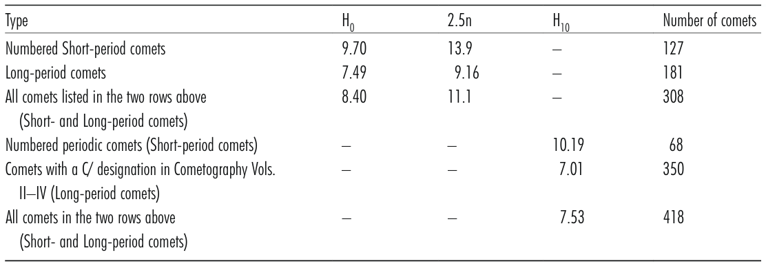 Mc = H10 + 5*log[Δ] + 10*log[r] (1.5)In (1.5), Mc is the measured comet magnitude made visually and corrected to a standard aperture of 6.8 cm, H10 is the normalized magnitude which is the brightness in stellar magnitudes that the comet has if it is 1.0 au from both the Earth and Sun, Δ is the comet-Earth distance, and r is the comet-Sun distance. Both r and Δ are in astronomical units. In (1.6), 2.5n is an adjustable parameter and H0 is the normalized magnitude for a given value of 2.5*n, and the other quantities are the same as in (1.5). The term 2.5*n in (1.6) is called the pre-exponential factor. Equation (1.5) has only one adjustable parameter (H10) whereas (1.6) has two adjustable parameters (H0 and2.5*n). An example of the evaluation of H0 and 2.5*n is presented in Chap. 3.
