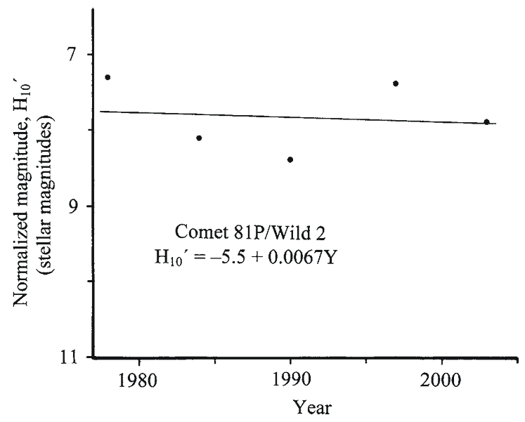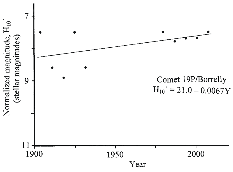 Mc = H10 + 5*log[Δ] + 10*log[r] (1.5)A second factor is the uncertainty in the brightness measurements. Measurements made with the eye have an uncertainty of 0.5 magnitudes, whereas those made with a photometer or a CCD camera may have an uncertainty of 0.01 magnitudes. Naturally, brightness measurements with small uncertainties are more likely to reveal long-term changes.