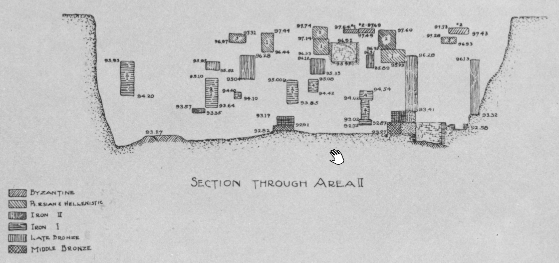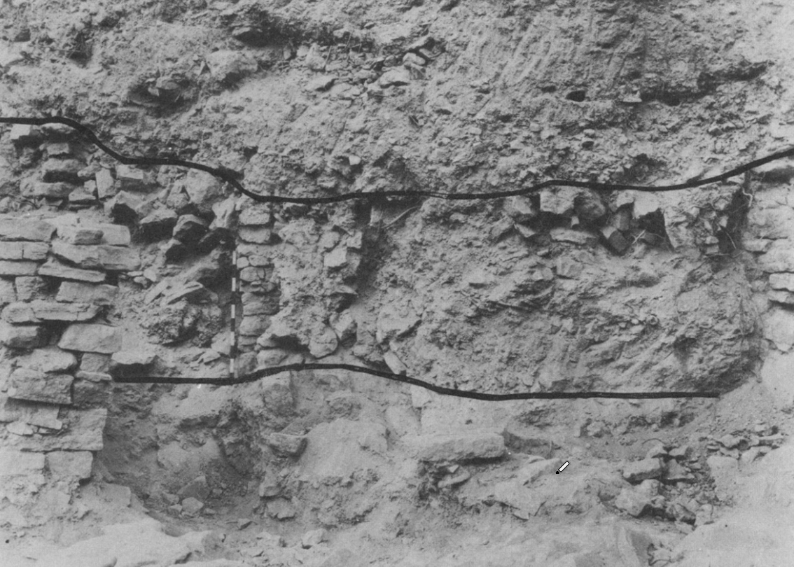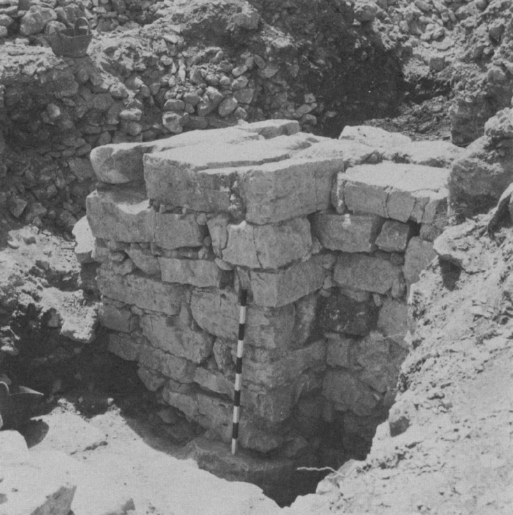 Plate 108aTemple above the high place; south wall of temple below (with meter stick) and south wall of city gate above. The latter is laid directly on the former. Kelso et al. (1968) Pl. 108b