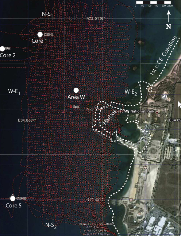 A massive strip of in-situ beach rock deposit, about 2.8 m-thick, is at 0.2–3.0 m below the present sea level. The deposit is located parallel to the coast, some 60 m west of the present shore and the remains of the aqueduct foundations (Figures 9 and 6f). This beachrock probably marks the location of the ancient coastline before the construction of the harbor and the aqueduct, and indicates that the shoreline has retreated horizontally some 60 m eastwards since the construction of the Roman aqueduct. This coastline shift must have occurred under stable sea-level conditions (p. 20, [41]). |