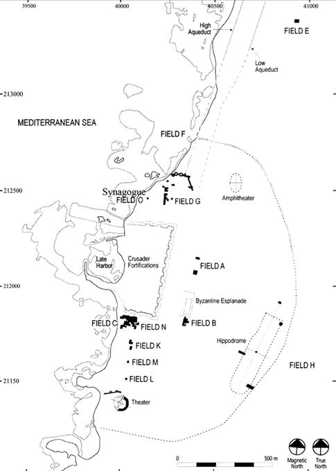 Large-scale archaeological excavations were carried out at Caesarea from 1992 to 1998 by the Israel Antiquities Authority (IAA); they were directed by Y. Porath. The project included the excavation of a 100–150-m-wide strip along the coast between the theater complex to the south and the excavations of the Combined Caesarea Expeditions (CCE) to the north; the western part of the temple platform and the area between this platform and the eastern quay of the port of Sebastos; both sides of the southern Crusader wall (continuing the salvage excavations carried out in 1989); the bottom of the Crusader moat (cleared in the 1960s by A. Negev), from the southern gateway to the northern gateway; and the area southwest of the theater. In addition, salvage excavations were conducted within the area demarcated by the Byzantine wall; in structures outside the wall; on the necropolis; in agricultural areas to the east, north, and south of the city; and along the aqueducts that carried water to Caesarea from outside the city.