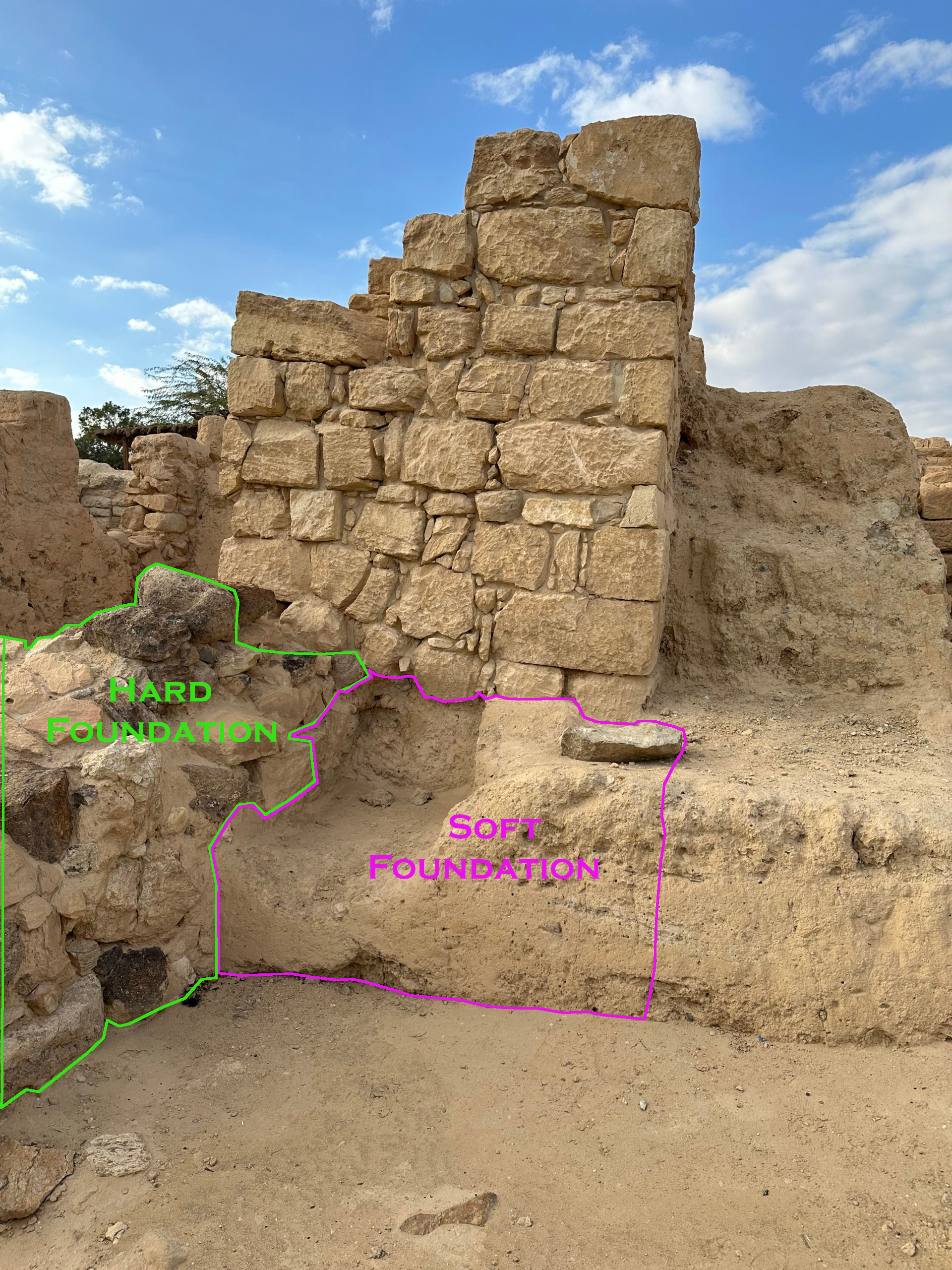 stone foundation over stratified sediment, and the tilt (with a fresh