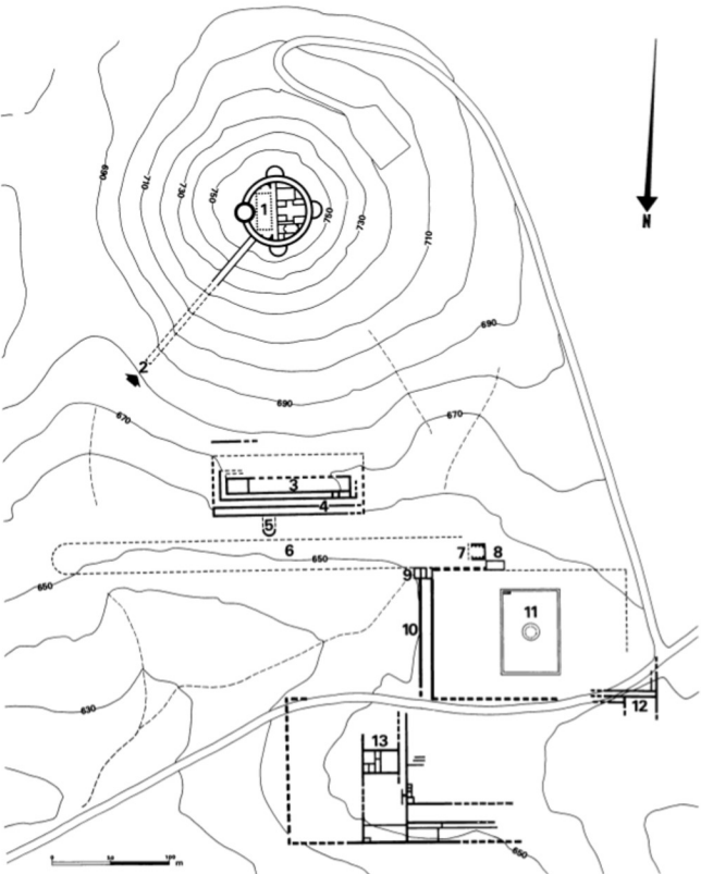 In the fifteenth century, the Italian traveler F. Fabri gave the name Mountain of the Franks to Herodium, the place where, he assumed, the Crusaders made a stand after the Arab conquest of Jerusalem (P PTS X, 403). It retained this name until the nineteenth century. The first sketch of Herodium's plan was made by E. Pococke during a visit in 1743. E. Robinson, in 1838, gave a detailed description of its buildings, dating them to the Roman period and noting their resemblance to Josephus' description. In 1863, the French explorer and traveler F. de Saulcy recorded important site details and drew sketches and plans of the buildings at the foot of the hill, especially of the pool. In his opinion, the round structure in the pool was Herod's burial place. Several years later, V. Guerin accurately described the outer wall with its three semicircular towers and eastern round tower. Until the modern excavations, the fullest account of the remains was made in 1879 by C. Schick, with plans and cross sections. He noted that the lower part of Herodium was a natural hill and the upper part was artificial. Schick traced the staircase leading to the structure on the summit of the hill; his assumption that the steps led to the courtyard of the building through a tunnel-like passage dug in the artificial fill was later confirmed. His further assumption that cisterns had been dug in the lower part of the hill was also later verified. In addition, Schick was correct in his belief that the upper structure had been designed as a grandiose mausoleum and not merely a stronghold. In 1881, C. R. Conder and H. H. Kitchener prepared the first accurate plan of the site with the two circular walls, three semicircular towers, and a round eastern tower.