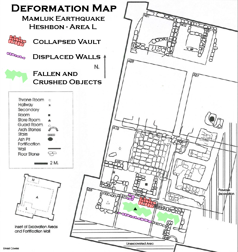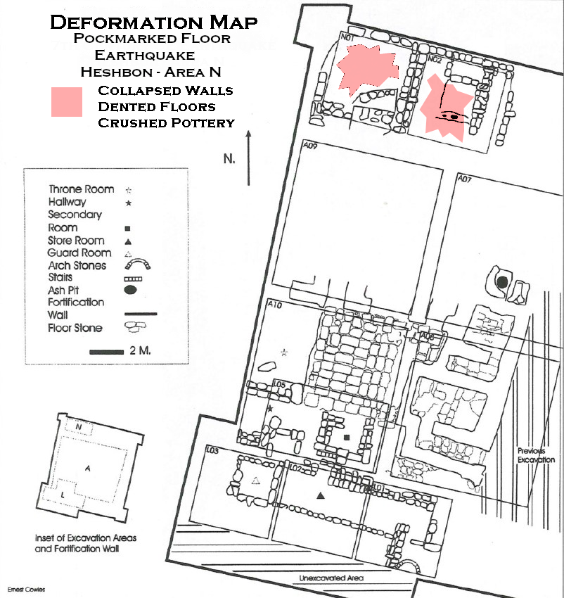 Dating earthquakes at this site before the 7th century CE is messy. Earlier publications provide contradictory earthquake assignments, possibly due to difficulties in assessing stratigraphy and phasing, but also due to uncritical use of older error prone earthquake catalogs. A number of earlier publications refer to earthquakes too far away to have damaged the site. Dates provided below are based on my best attempt to determine chronological constraints based on the excavator's assessment of primarily numismatic and ceramic evidence. Their earthquake date assignments, at the risk of being impolite, have been ignored.