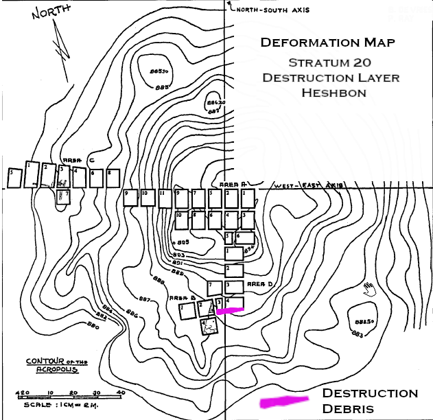| 20 | Iron IA–IB | 1150–1100 B.C. | Tell Hesban appears to have been a large fortified village during this stratum. Though the tell was naturally defensible on three sides because of its steep sides and deep wadis, the occupants of this early settlement dug a trench in bedrock on the weak southern side of the mound. This feature appears to have functioned as a dry moat. Large amounts of stone within the destruction debris found in the trench suggest the possibility that a fortification wall may also have originally stood above it. The ceramic evidence would again suggest that the village was inhabited by Reubenites. |
