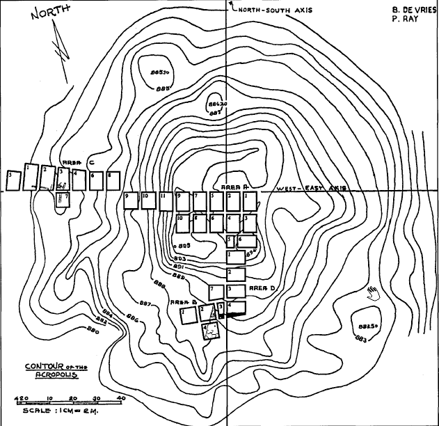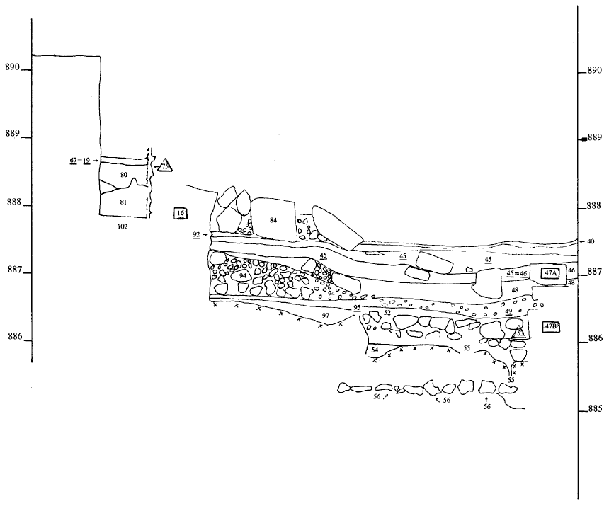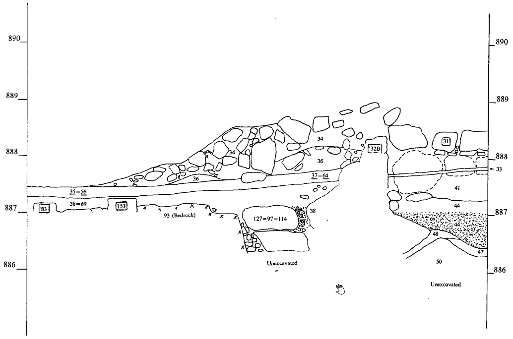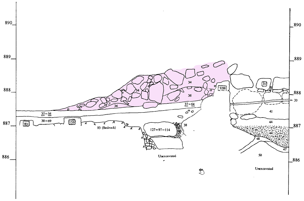 The meager remains of this stratum are confined to a bedrock trench on the southern shelf (in Squares B.2, B.3, and D.4; figs. 5.4-9) and a cistern along with its bottommost soil layer on the Acropolis in Square D.1.