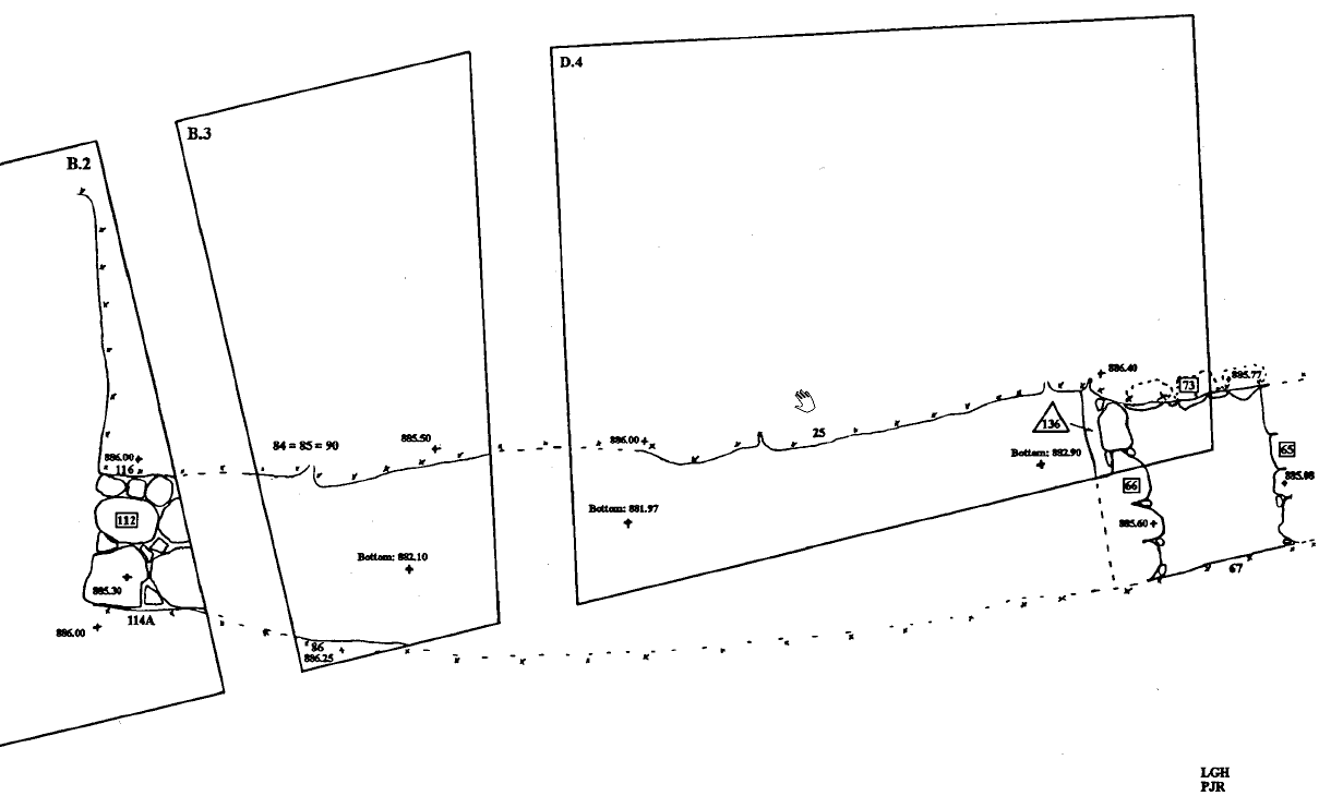 Evidence for Stratum 14 occurs virtually all over the tell, either in primary or secondary contexts. Most of the Stratum 14 remains in Area C appear to be secondary deposits, probably the result of Stratum 13 clearing operations on the tell summit. For the same reason, Area A has few connected remnants of Stratum 14 occupation. In Area D most of the loci of Stratum 14 come from beneath the bedrock fill of Stratum 13, though Square D.2 does have a good series of Stratum 14 surfaces (or floors). The same picture tends to hold for Area B, with the exception of some occupation evidence over Stratum 15 reservoir fill in Square B.4, and to a lesser extent in Square B.2.