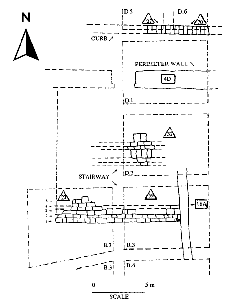 Given what we know from the written sources, along with the facts of the site's location, it is possible to make some synthesizing suggestions even though the remains for Stratum 15 are meager. We do know a number of key things: (1) the summit of the tell was stripped to bedrock, at the least over the entire extent in which Area A was excavated to bedrock, and probably a much larger expanse; (2) the summit was surrounded by a massive fortification wall nearly 2 m thick, which may well have from the beginning followed that outline traced by the Heshbon Expedition’s surveyor/architects (fig. 2.3); (3) at some distance from the so-called “perimeter” wall itself, a succession of soil layers and/or surfaces with a few walls have been excavated, namely in Probes G.1 and G.12 on the southeast and south sides of the summit mound, respectively.