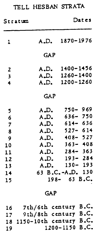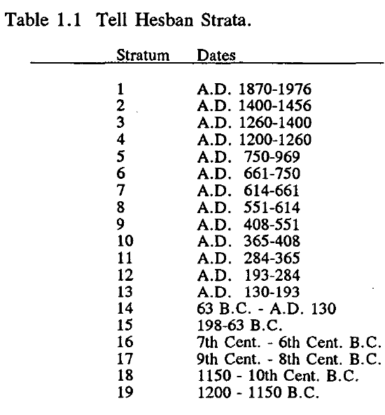 | 21 | LB/Iron I Transition–Iron IA | 1225–1150 B.C. | Very little exists from the first recognizable settlement that was built on Tell Hesban. The extant remains consist of ceramic material found within dump layers on the western side of the mound. Nevertheless, this evidence, when compared with that of some other tells in the immediate region as well as sites in the Central Hill Country of Cisjordan, suggests that a small village of Reubenites existed on the tell during the Late Bronze Age/Iron Age I transition. |