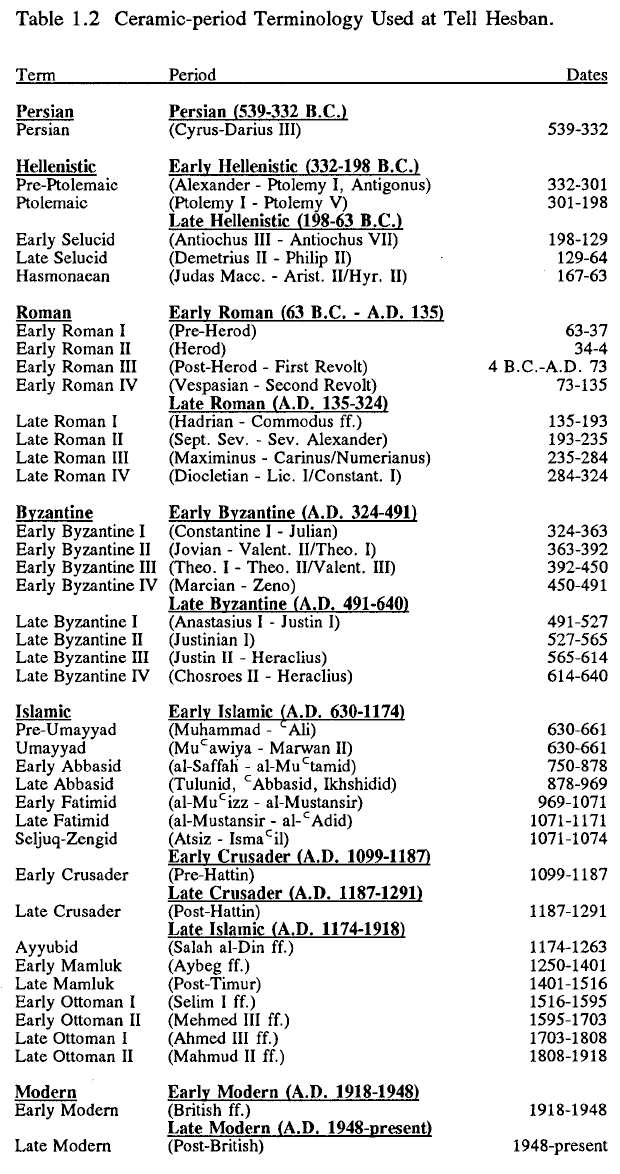 | 17 | Iron IIB | 925–700 B.C. | Iron Age IIB Hesban appears to have been rather sparsely inhabited and would seem to have been a Moabite squatter settlement as indicated by its ceramic makeup. I have suggested that an early Moabite occupation toward the end of the tenth century B.C. was expanded (slightly) by either Mesha or still later Moabites. They appear to have extended their territory north to Hesban and made use of its dominating position at the crossroads of the major highways to gather tolls. I have further suggested that they cleaned out and replastered the reservoir and used it for its capacity to hold large amounts of water. On the basis of the faunal remains, the occupants of the tell at this time seem to have been mainly pastoralists. Thus, this period appears to have been one of abatement, when the inhabitants of the site returned to range-tied pastoralism and a low to medium intensity food regime. |