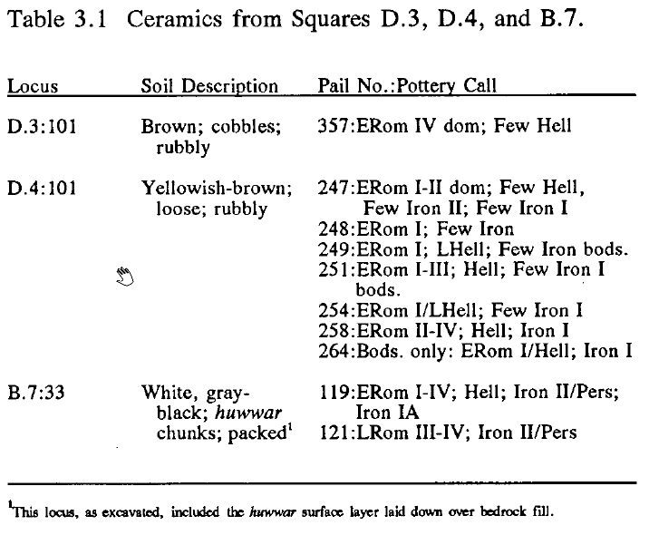 | 12 | 193-384 CE | Stratum 12 represents a continuation of the culture of Stratum 13. On the summit of the tell a large public structure was built; partly following the lines of earlier walls. This structure is interpreted to be the temple shown on the reverse of the so—called "Esbus Coin", minted at Aurelia Esbus under Elagabalus (A.D. 218 — 222). |