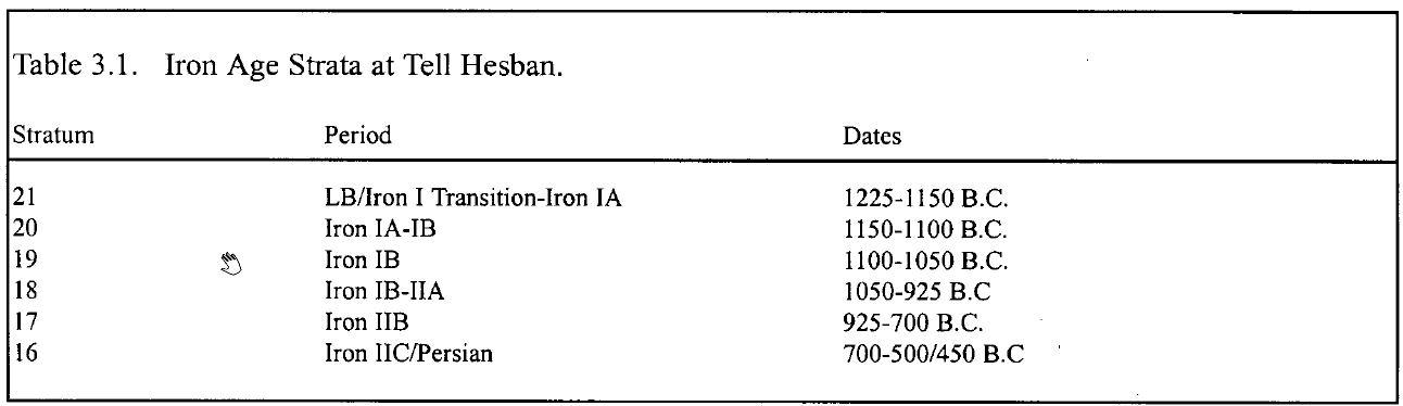 | 18 | Iron IB–IIA | 1050–925 B.C. | The Reubenite village of Stratum 19 appears to have grown into a small town during Stratum 18 under the auspices of the kingdom of Solomon.