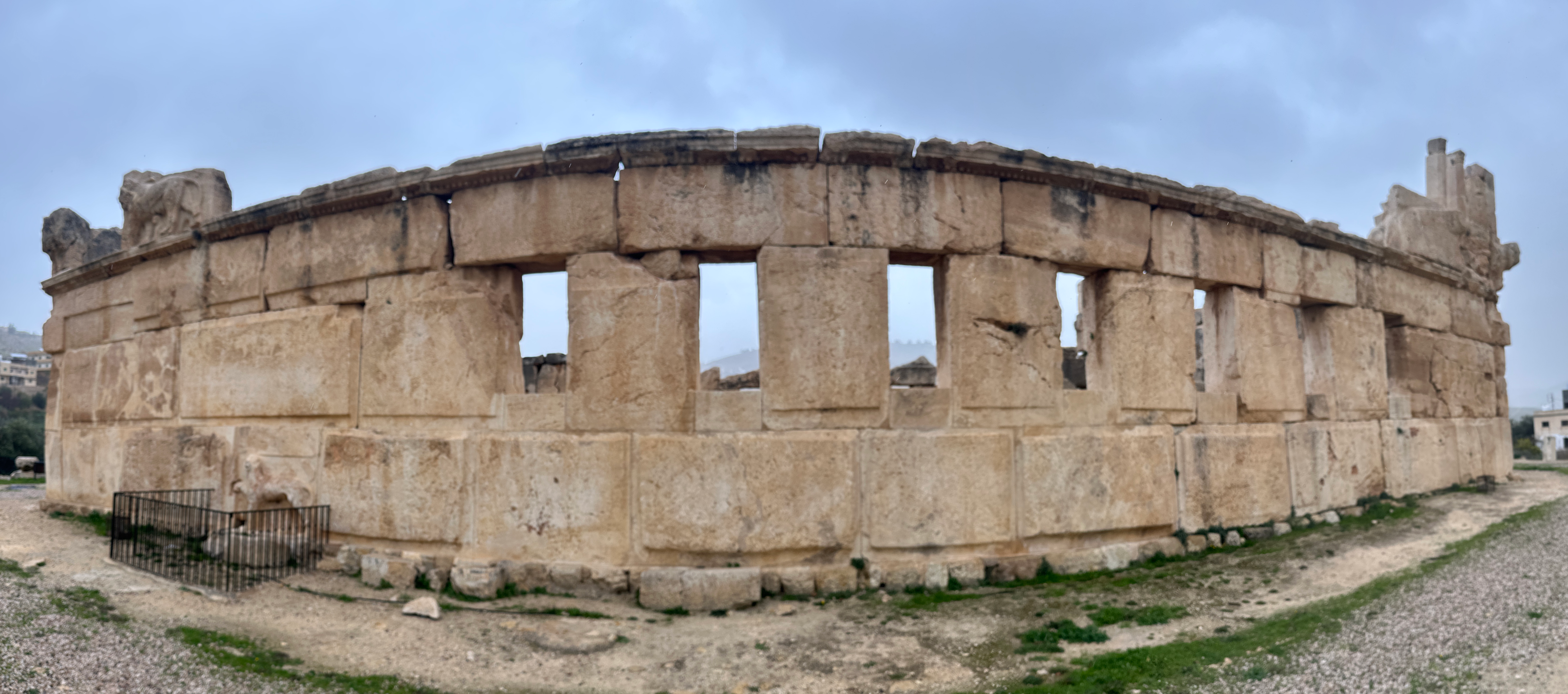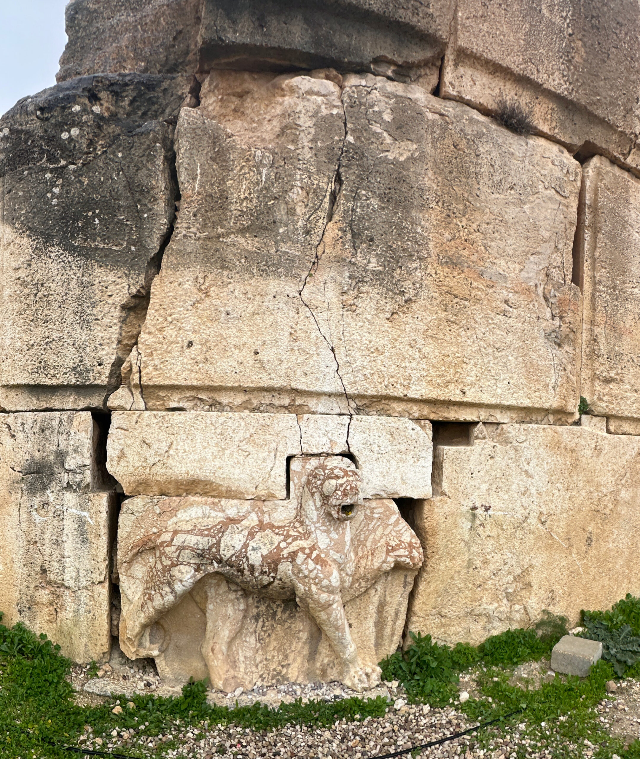The architectural conclusions of E. Will, the director of the Institut Francais, like those of the preceding excavators, are that a Hellenistic building, the Qasr, constructed by Hyrcanus, was left unfinished at the beginning of the second century BCE. After several seasons of work, and with the use of heavy equipment, he and his assistant, F. Larche, were able to uncover and analyze architectural elements and theoretically reconstruct the probable structure planned and partially executed by Hyrcanus. Detailed plans are now available for the north facade, including the evidence that the lion frieze continued from the east to west walls, and for the reconstruction of the corner towers recognized by Lapp and others. When the west side was cleared, walls were uncovered lying face down, the way they had collapsed, outward. Long slabs in the first course of stones laid horizontally held second-course blocks set vertically. This left spaces for windows; small blocks of stone were used as sills between them. Some lintel and cornice blocks above the windows have been reconstructed. Corrections have been made in Butler's earlier plan, most notably in the elimination of the half columns he thought had filled the spaces (windows) between the vertical block. The accuracy of this reconstruction is more certain for the lower courses, revealed through excavation, than for the top courses with the lion frieze.