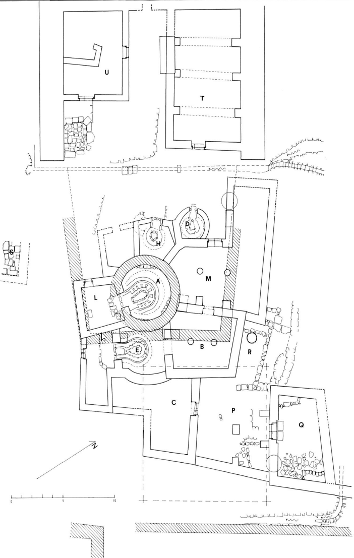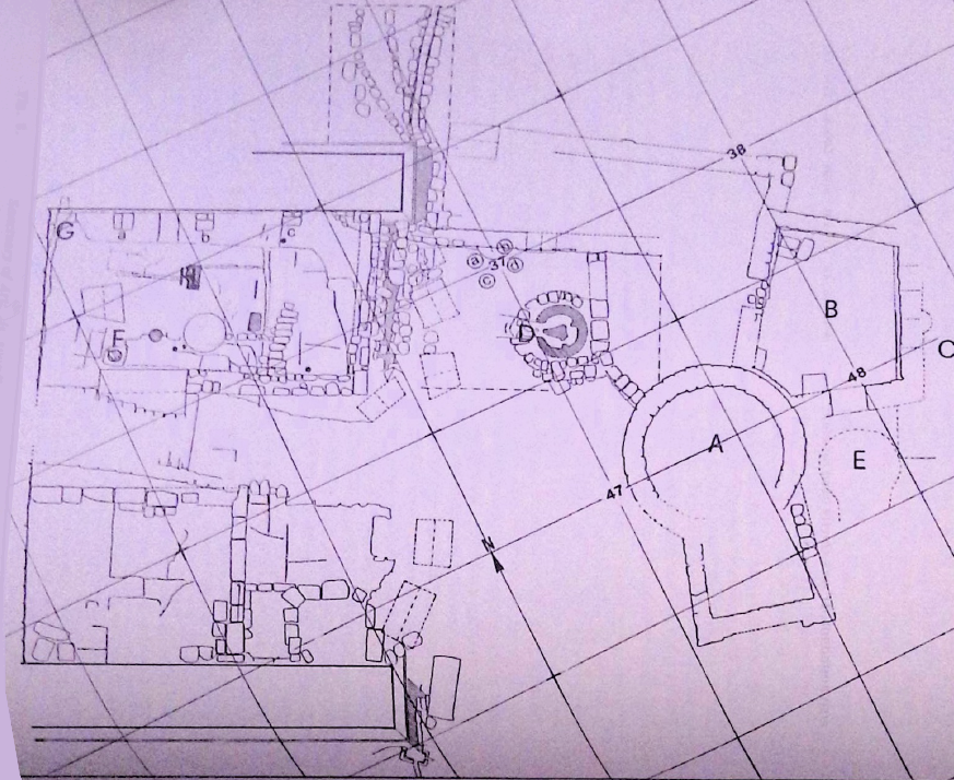 ... The hollow G in the N-W corner dropped down underneath the north wall of the podium where a stone is missing. The pottery finds, of the same type as those in the cistern, were here associated with a bronze coin of Hadrian.