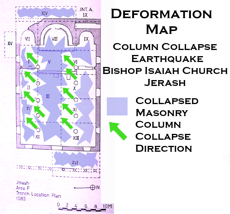 13 Strong earthquakes which may have destroyed the church ocurred in 717 AD and 746 AD. Without further analysis it is impossible to attribute the destruction to a specific date. See, howevere, R.H. Smith, Pella of the Decapolis, College of Wooster, 1973), pp. 163-167 for a discussion of these earthquakes with regard to Pella. JW: I would advise against this.