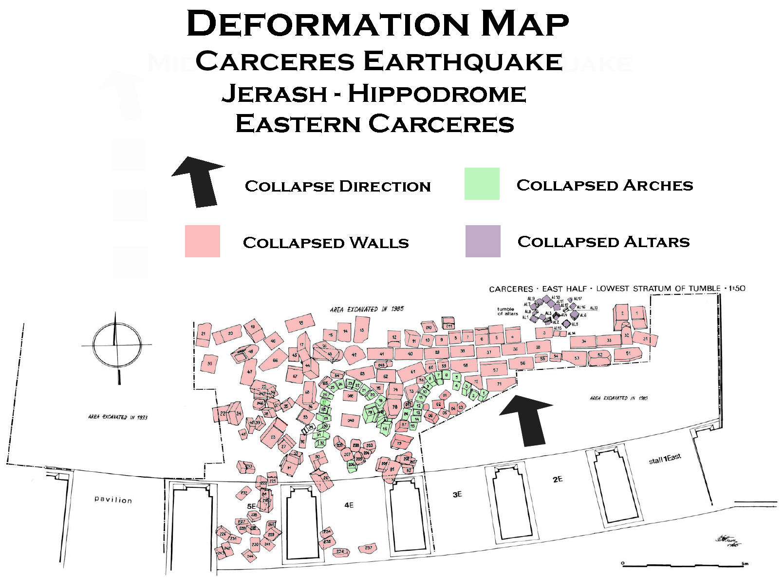The fallen stones show the direction of fall of the carceres. It has been observed that `During an earthquake the columns, pilasters, and walls of structures have a tendency to collapse in the opposite direction of the quake's epicenter or hypocenter.' (Russel 1985: 51-52) Accordingly, the directional pattern of collapse of the carceres indicates that the epicentre or hypocentre of the earthquake which destroyed the structure was to the south of Gerasa. The reconstruction of the process of the collapse points to a forceful earthquake. The recent studies of the earthquakes in the region of Palestine and northern Arabia from the 2nd throughout the 16th century elucidate the stronger and weaker earthquakes known in that period and region. Accordingly, both phenomena - the directional pattern of collapse and the strength of this earthquake - are, then, additional evidence (beside the deposit sealed by the tumble) for dating the occurrence (infra).