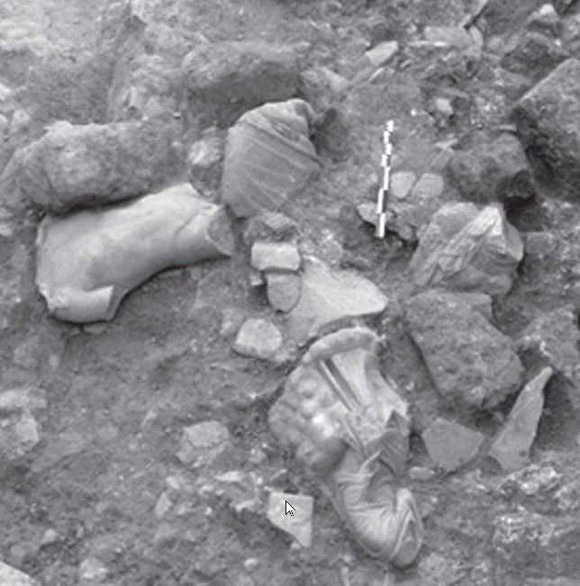 ... Almost all statuary fragments came to light in room M under the first destruction layer, which was marked by densely collapsed rubble of massive blocks, mostly from the lavishly decorated entablature which had collapsed during the disastrous earthquake of 749 AD. Even though this catastrophe may have caused further damage to the statues, their deposition in the stratum underneath was, however, a result of previous destructive human activities. People had intentionally accumulated and then smashed sculptures on the rubble above the limestone pavement of room M, obviously to send them for burning, in order to produce lime for domestic construction. This is definitively the reason why major parts of the torsi have not been found, particularly the heads or body extremities. The sugar-like, decayed porous surface of some of the fragments indicates they have been exposed to high temperatures. Even though there is no material evidence for a kiln or furnace, we must take into account that the sculptural fragments are the sad remains of a systematic industrial recycling process. Obviously, the sudden earthquake interrupted this activity and preserved some large parts of marble figures. As a consequence, the find position of a sculpture does not provide any clue for reconstructing its original arrangement within the northern hall. One cannot even exclude the possibility that some of the statues had never decorated either the baths or the northern hall, but had been brought from another area in the urban topography to the designated place for firing10. To our present knowledge, the hoard of marble statuary which has been uncovered was definitely destined for destruction by firing, certainly under the auspices of fundamentalist religious (Christian?) iconoclasts.
