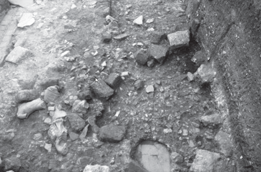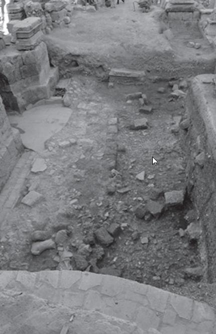 In 2016, the discovery of a wall constructed with Roman spoils in the northeastern part of Area M (MUR 55004) led to the discovery of a room-shaped dwelling (Fig. 4), which was obviously constructed after the demolition of the ancient monument. All the walls of this dwelling, which were cleared during the 2017 excavation, rested on a 30-50 cm thick soil deposit, which covered the Roman pavement. The remnants of this later structure were completely cleared within the limits of the excavation trenches.