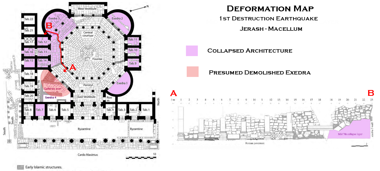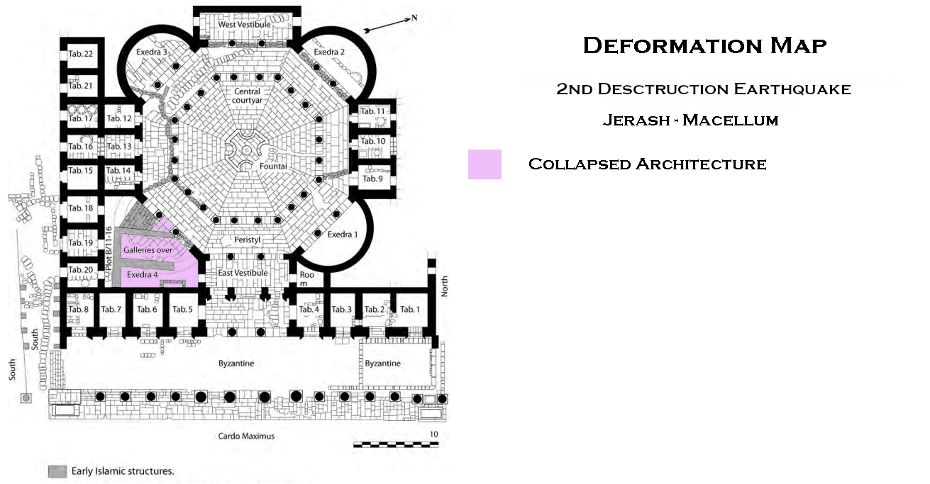 This destruction was previously dated to the early seventh century, but now we are compelled to withdraw this date and propose, on the basis of both pottery and coin data, a mid-seventh century chronology for this collapse, that is some 20 years later than the first proposed chronology. However, this corrected date for the Macellum destruction does not affect the established pre-Islamic phases of the building.In addition to the collapse layers found throughout the Macellum, vaulted Islamic galleries were constructed over where exedra 4 once stood. It can be presumed that exedra 4 was demolished and cleared away before construction of the galleries began.