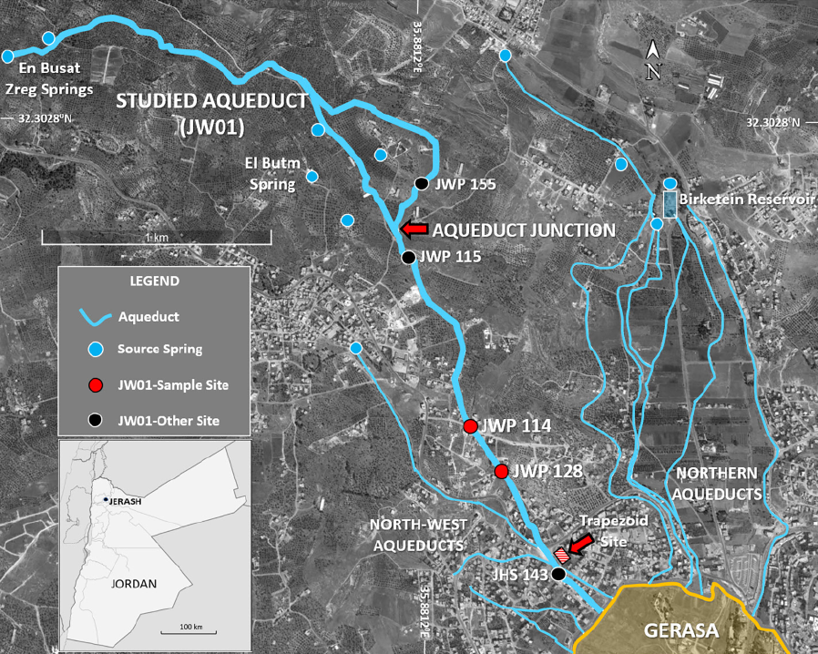 Gerasa had a network of more than ten aqueducts providing water to the north-west part of the city from extramural karst springs in Roman Imperial times (Fig. 1; Boyer, 2016; 2019; Stott et al., 2018). Recent construction has erased most traces of these aqueducts close to the city, but they can be reconstructed from ground surveys and aerial photographs (Stott et al., 2018). We focussed on JW01, the largest and best-preserved aqueduct, exposed at several locations, mostly as a rock-cut channel that was at least partially covered by capstones (Fig. 1; Boyer, 2019). It derived its water from springs to the north-west supplied from Upper Cretaceous limestone aquifers (Hammouri and El-Naqa, 2008; Boyer, 2018; 2019): this includes the springs of En Busat Zreg (32.30577° N, 35.86196° E - Fig. 1) and probably Fauwara (32.31257° N, 35.85077° E) and Mafthasil (32.31706° N, 35.83869° E) to the west. The average gradient of sections of the aqueduct varies from 3.6% to 21% (Boyer, 2019), leading to a locally high flow velocity (Supplementary material S2). The aqueduct was dated using 14C AMS of charcoal in plaster and was likely in use between the 1st century BC/1st century AD and the early 3rd century AD (Supplementary material S3; Boyer, 2019).