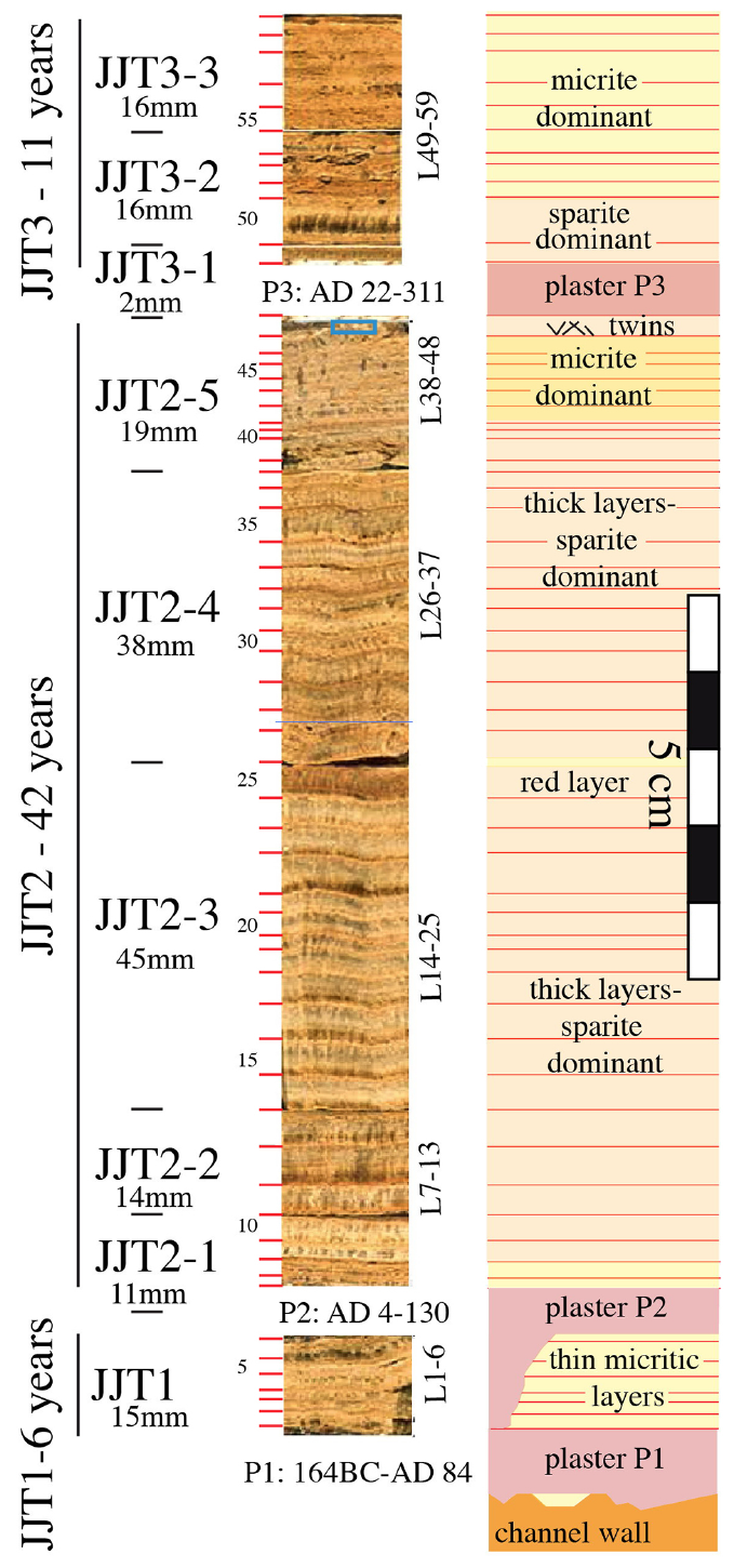 The sampled carbonate stratigraphy of JWP128 consists of three sequences labelled JJT1–3, separated by layers of grey plaster (Figs. 2b and 3). Thin sections show a rhythmic sequence of similar layers of variable thickness (Figs. 3–5), each with an alternation of micrite and elongate columnar sparite crystals. Micrite and microsparite crystals are 2–10 μm in diameter, while sparite crystals can be up to 2 mm wide and 7 mm long. The alternation of micrite/microsparite and sparite, in combination with stable isotope cycles, allows counting of annual layers (L1–59; Figs. 3 and 4).