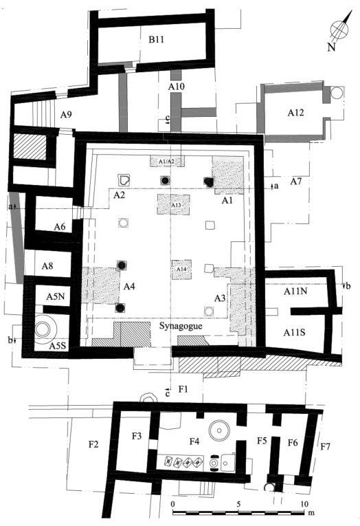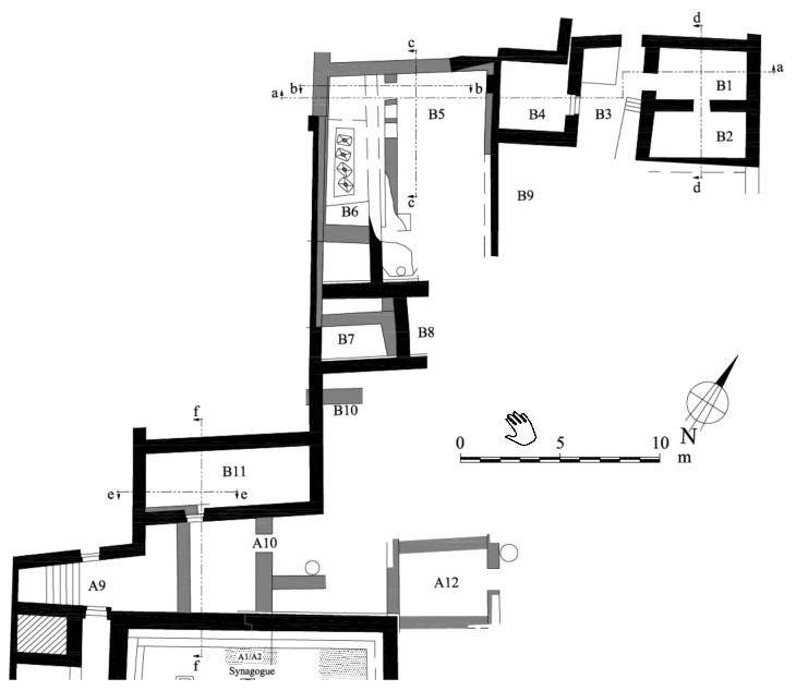 Block plan of the synagogue (in black) showing the excavation areas (A, B, F), units, soundings (dotted raster) and the major section lines through the building