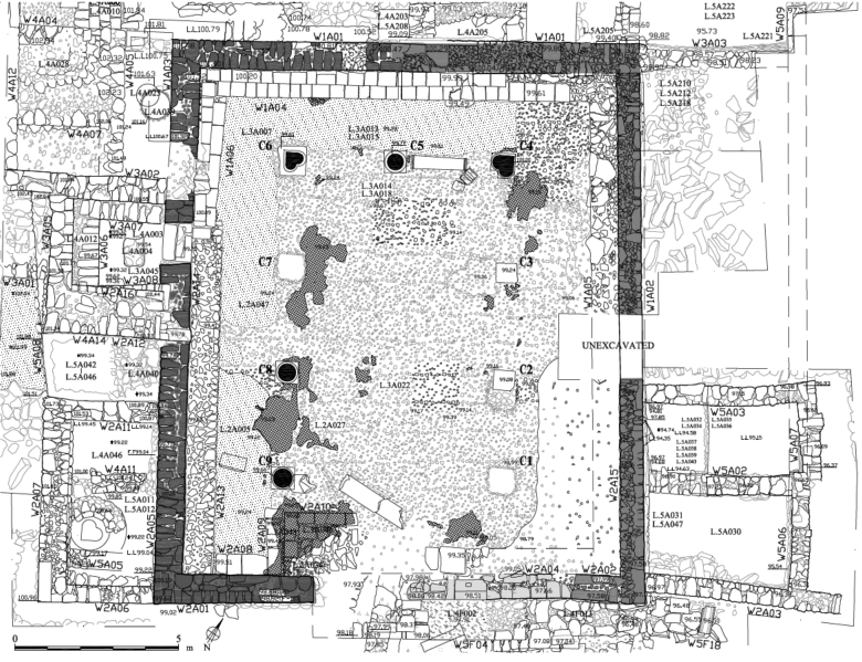 ... In summary, although the plan of this area in Stratum 3 is unclear, the northern wall and the blocked underground chamber seem to date back to that period. Unit C 1, as it has survived, clearly belongs to Stratum 2. Based on the width of this unit, which would be difficult to roof, and on the storage installations along the northern wall, it was probably an inner courtyard fronting the dwelling to the west. The huge collapse that buried this unit hints of destruction caused by an earthquake, most likely that of 363 CE. The chronologically homogenous finds above the floor seem to indicate that the structure remained untouched until our excavation.