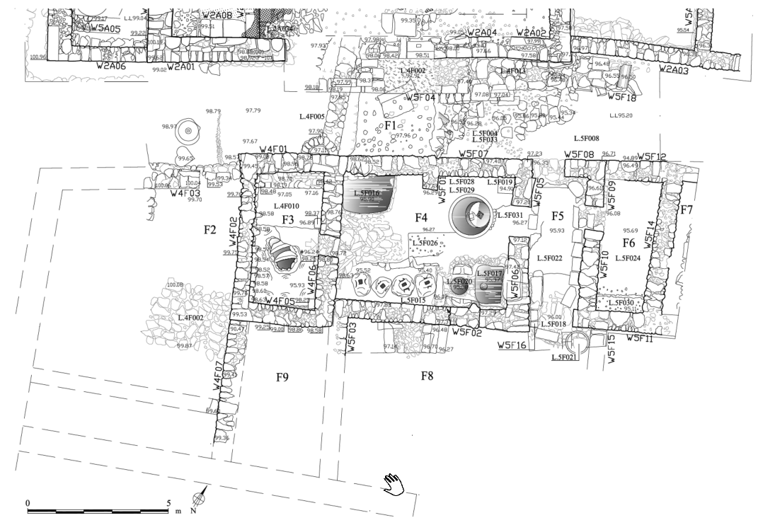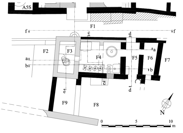 The northern wing of this large insula was excavated almost in its entirety, with some information of other parts also revealed (Fig. 6.60). Little is known of the plan of this area in Stratum 3, as only the western room (Unit F3), and perhaps the northern wall of Unit F4, could be dated securely to that period. The insula as a whole, as presented here in Fig. 6.40, belongs to Stratum 2, and the finds from probes beneath the floors and against wall foundations in several locations point to a date in the early third century for its construction. The existence of an olive-oil press in the midst of what seems to be a domestic complex is surprising, and even more intriguing is its location opposite the synagogue in the center of the village.