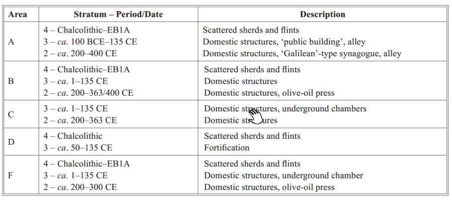 | 4 | Late Chalcolithic / Early Bronze Age IA | ca. 4500–3300 BCE | “The earliest remains, dated to the Late Chalcolithic period and Early Bronze Age IA, were entitled Stratum 4. Most of the finds from these periods were retrieved near bedrock and in fills beneath structures of Stratum 3 in Areas A and F. They comprise hundreds of pottery sherds and flints, a few groundstone implements and a zoomorphic clay figurine. No architectural remains could be assigned with certainty to this stratum, although the abundant small finds attest to extensive activities at the site during this era.” |