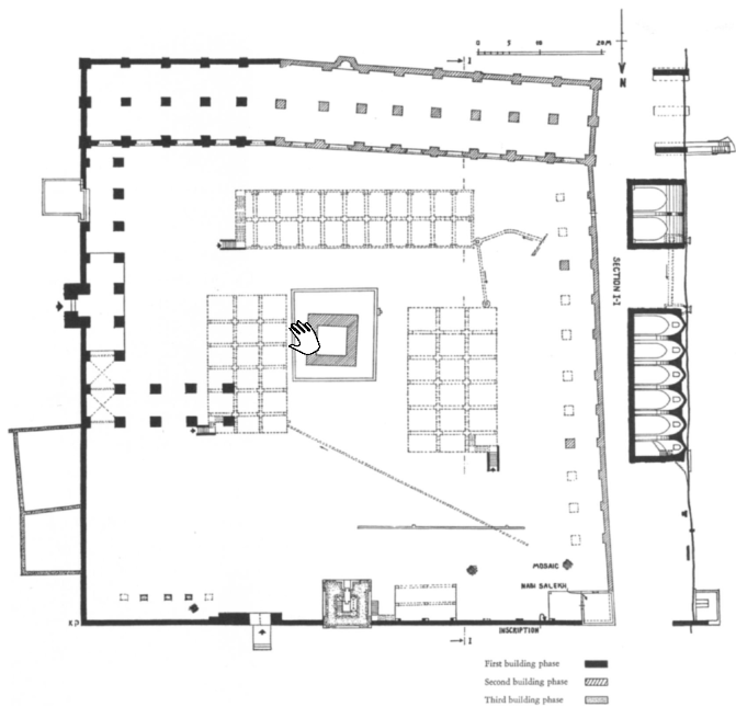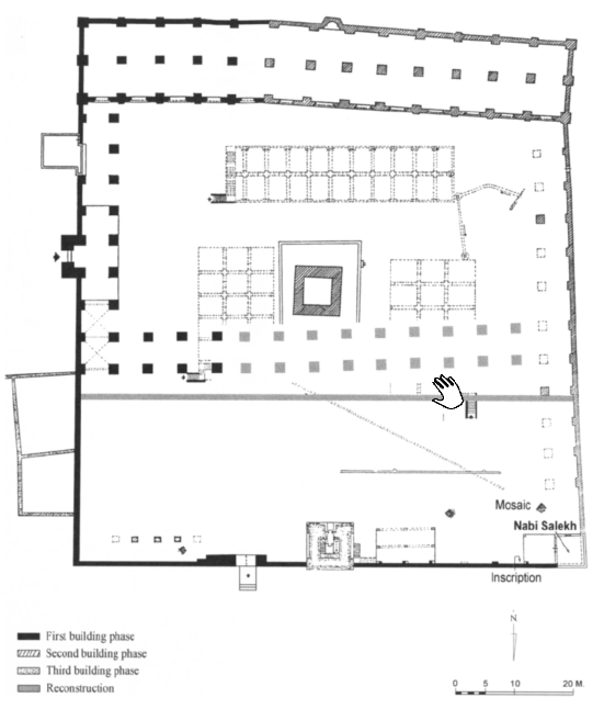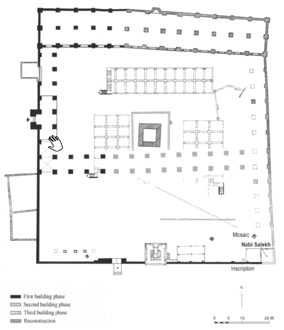 Excavations at the White Mosque were conducted by J. Kaplan in 1949 on behalf of the Ministry of Religious Affairs and the Israel Department of Antiquities and Museums. The excavations attempted to ascertain which buildings, both above ground and subterranean, belonged to the original mosque enclosure. It was revealed that the mosque enclosure was built in the form of a quadrangle (93 by 84 m), with its walls oriented to the cardinal points. It included the following structures: the mosque itself; two porticoes along the quadrangle's east and west walls; the north wall; the minaret; an unidentified building in the center of the area; and three subterranean cisterns.