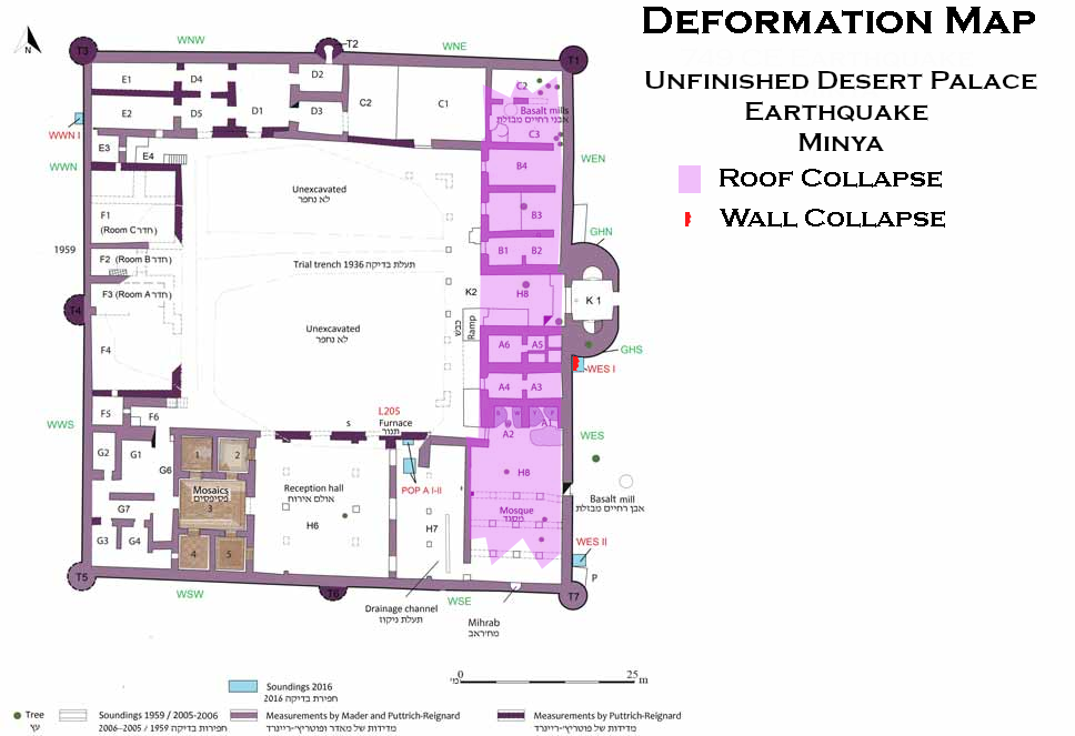 Kuhnen et al (2018) reports that excavations indicate that the palace was not completely finished before it was damaged by an earthquake which they presume to have struck in the mid 8th century CE. Square WES I, excavated at the corner between the eastern curtain wall and the southern gate tower, contained evidence of collapse.