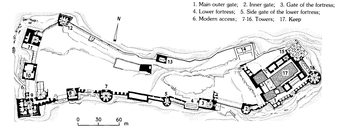 Tower 7 (17.5 min diameter) forms a semicircular projection from the line of the fortress wall. The part of the tower inside the fortress is rectangular. At its center a large column supports a unique ceiling-a pointed annular vault. Visible in the upper part of the outer wall of the tower are projections that undoubtedly supported machicolations used as outposts to defend the base of the tower. Steps along the wall of the tower, inside the fortress, led to an upper story that has not survived.