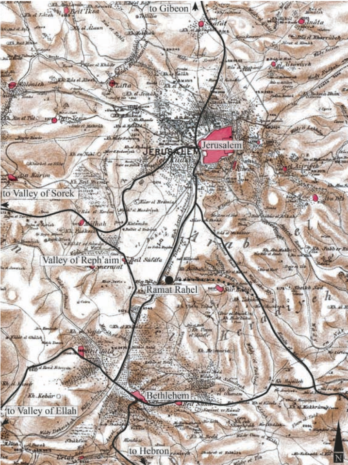 The mound of Ramat Rahel is situated on a prominent hill (818 m above sea level) almost midway between the Old City of Jerusalem and Bethlehem. The site is occupied today by Kibbutz Ramat Rahel (map reference 1708.1275). The ancient name of the site has not been preserved, but about 400 m west of the mound is the well of Bir Qadismu, which preserves the name of the Byzantine Kathisma (Καθισμα) Church.