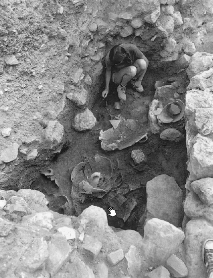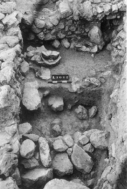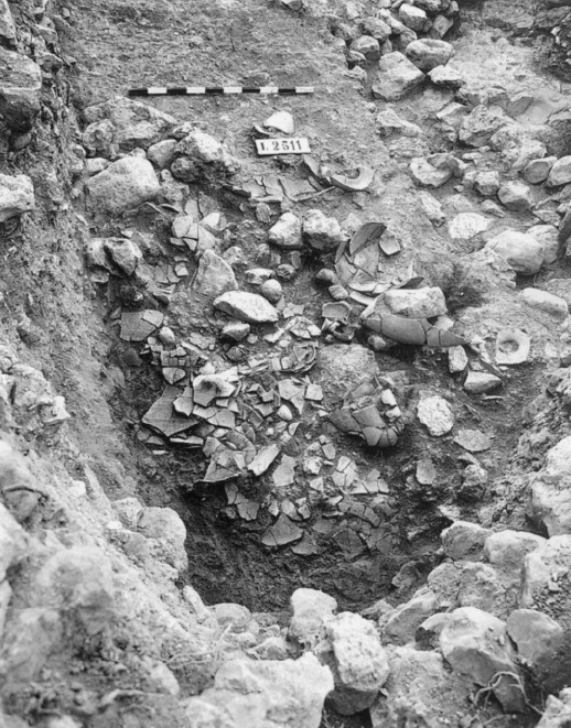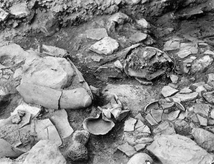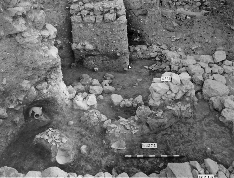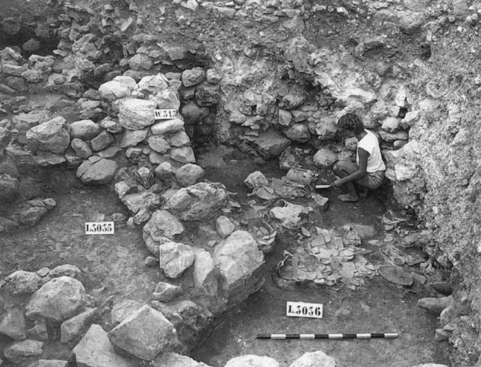The destruction layer of the final Late Bronze Age city, looking south. Broken vessels and an ash layer are clearly visible. Note the accumulation of debris over remains of Stratum XIXa and below the foundations of Iron Age I walls (Stratum XVIII). click on image to explore in a new tab Ben-Tor et al. (2005b) |