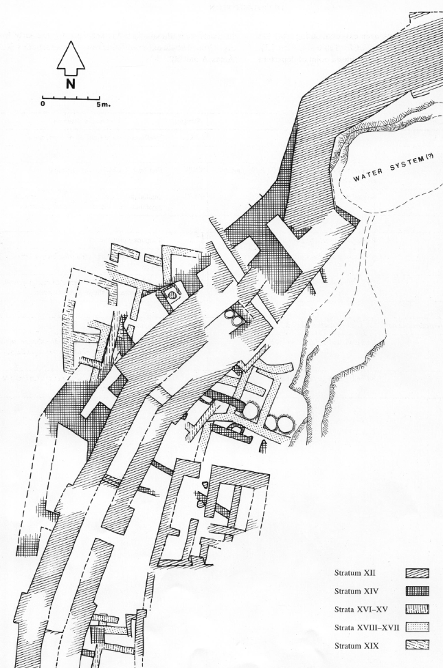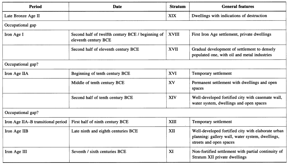 The location of the massive Iron Age IIA and B fortifications (Strata XIV and XII) has restricted the excavation of the early strata to limited, physically discontinuous areas. Nonetheless, the remains from Iron Age I strata, however fragmentary, allow for a reconstruction of the settlement during that period (the second half of the twelfth century BCE and the eleventh century BCE). In most of these strata (as well as in those assigned to the Middle Bronze Age II and Late Bronze Age), the inhabited areas extend beyond the boundaries of the Iron Age IIA and B cities; moreover, they are built along the same orientation, which changes only in Stratum XIV.
