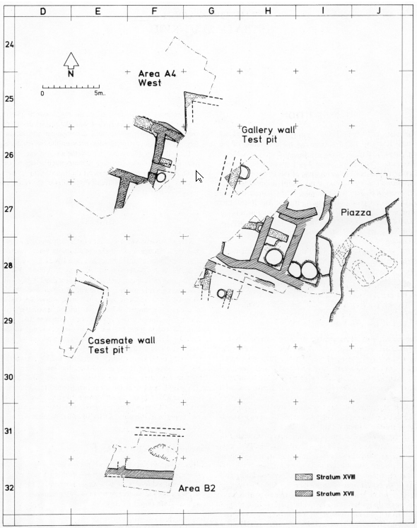 Area A4 (Plans III.I–5) is the more southerly of the two excavation areas opened on the western slopes of the mound outside the Iron Age fortification complex. Immediately below the remains of the earliest Iron Age I stratum (XVIII), two strata were exposed, both dated to the Late Bronze Age. Each of these strata revealed two construction phases: XXb–a and XIXb–a. The stratigraphic sequence, together with the ceramic assemblage, indicates that Stratum XXb should be dated to the MB IIC/LB I transition, and Stratum XXa within LB I. In contrast, both Strata XIXb and XIXa are dated to the second half of the Late Bronze Age. Because the Late Bronze Age architectural remains are better preserved in Area A4 than in Area A1, the discussion begins with the findings from Area A4 and then turns to the remains in Area A1.