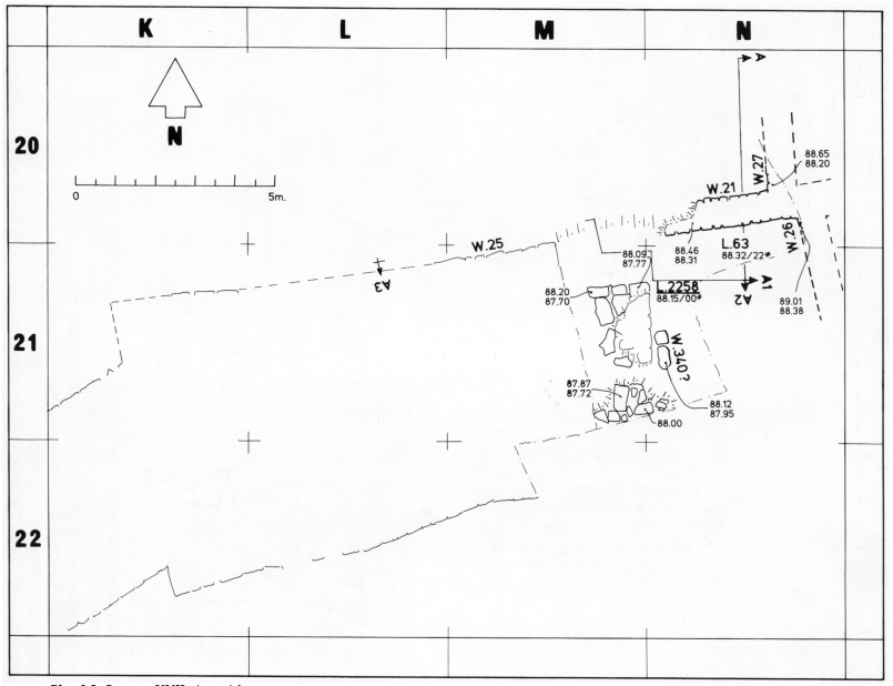 This stratum is represented by architectural remains of a fragmentary nature, displaying no continuity with the previous stratum. These include several walls: W.21, running east–west, perpendicular to W.26 to the south and W.27 to the north. It is difficult to determine the plan of this structure. A floor of pebbles and packed earth, L.2258 (incorporating L.63; Fig. 1.2), was also exposed, with stone paving to the south. Part of the latter may have functioned as a foundation for a mudbrick wall (a great number of such bricks were found within collapses all around); such a wall, however, could not be readily discerned. This floor, like the one from the previous stratum, is tilted westward.