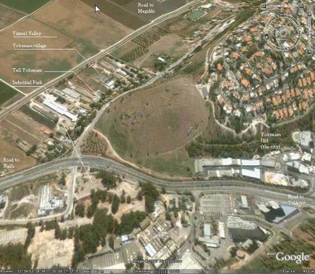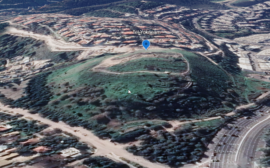 Jokneam (Tel Yogneʿam), a large mound rising above the surrounding plain and covering an area of 10 a., is situated at a point along the abutment of Mount Carmel and the Jezreel Valley, near the debouchment of Naḥal Yoqneʿam (map reference 1604.2289) and at the northern outlet of Wadi Milt (Naḥal Tut), on one of the major routes cutting across the Carmel Range. Via the Coastal Plain, the route passes close to Acco and then runs toward Phoenicia and other centers to its northwest.