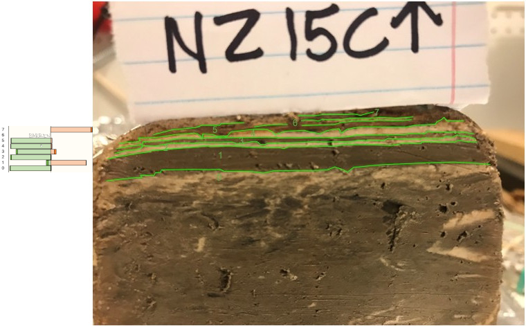 | RCNZ18200 | JW: 3 big twigs no field photo just above RCNZ18118, Lab: Wood - in seismite | 179 | 1664 | 30 | ||