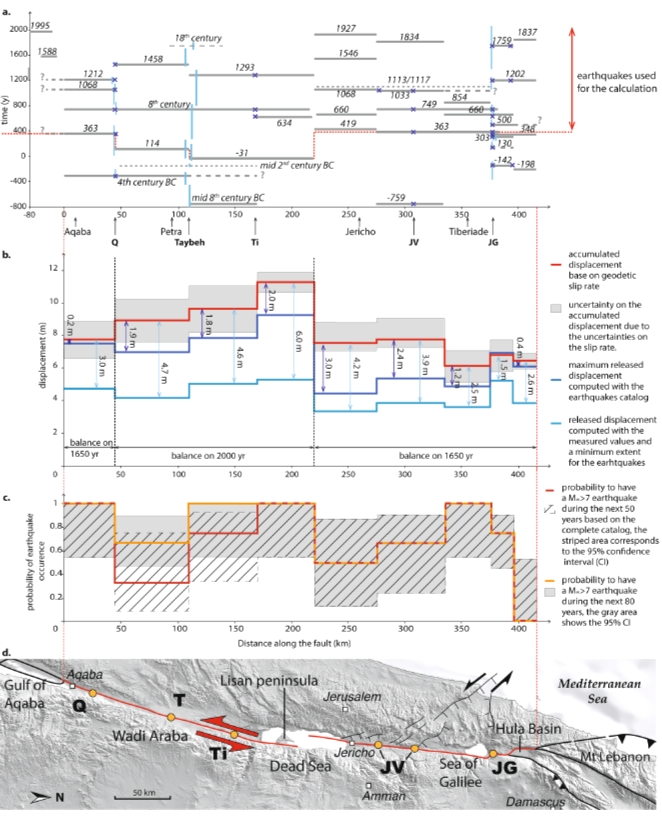 To test the hypothesis of temporal clustering along the southern DSF, we expanded the earthquake catalogue for the area from southern Lebanon to the Gulf of Aqaba based on published literature (literature review in supplementary mat.) (Fig. 3a). As for the Wadi Araba fault, based on location of major jogs and bends we defined nine segments along the southern DSF, which are from south to north: three segments in the Wadi Araba, the Lisan peninsula segment, the Jericho segment, two segments in the Jordan valley, the Jordan Gorge segment and the Hula basin segment (Fig. 3d).