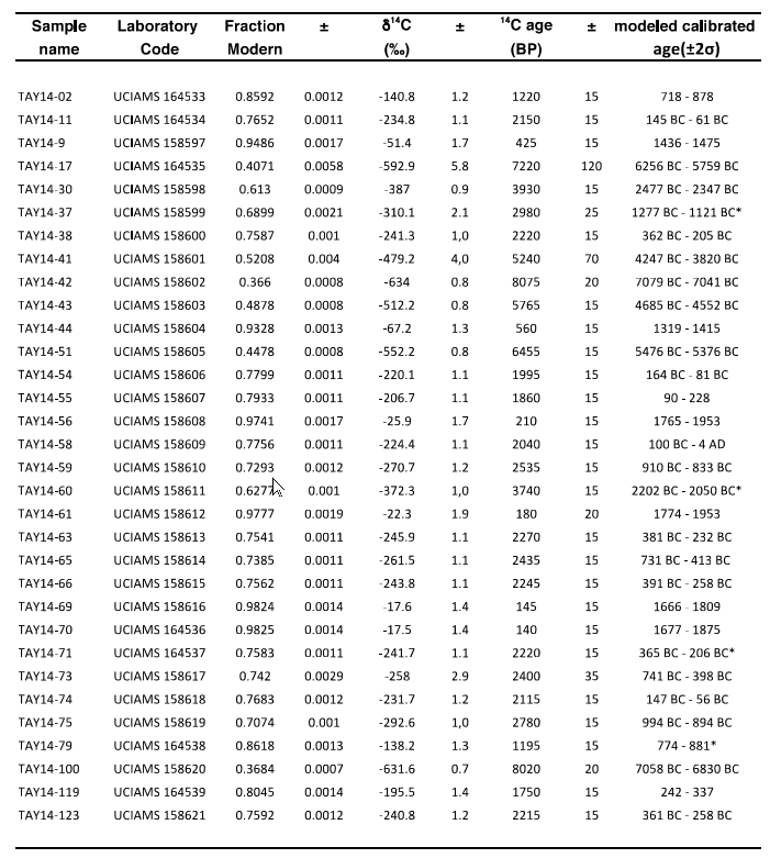 Time constraints were derived from accelerator mass spectrometry (AMS) radiocarbon dating of detrital charcoals. The trench exposure presents a relatively rich and well-distributed amount of datable material. 32 charcoals coming from the two walls of the trench were dated (Tablesup 1, Fig. S4), we mainly used material from the southern wall, and few charcoals were collected on the other wall (charcoals 2, 9, 11, 17, 100, 119, 123) when there was no datable material on a layer in the studied wall. Only 4 samples (37, 60, 71, 79) had to be rejected, because their ages were significantly older than the other ages, relatively to their stratigraphic position. We interpreted them as likely reworked samples.