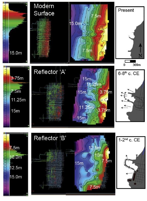 Ancient harbour sediments and stratigraphy are often studied because they contain evidence of past environmental change including climate, sea-level, and anthropogenic activity (Blackman, 1982a, 1982b; Kamoun et al., 2019, 2020, 2021; Marriner and Morhange, 2007; Reinhardt et al., 1994; Riddick et al., 2021; Riddick et al., 2022a, 2022b; Salomon et al., 2016). The analysis and interpretation of environmental proxies (e.g., microfossils, geochemistry, lithology, etc.) can be more straightforward in cases of shoreline progradation, where relative sea-level changes, siltation, and/or high input of river sediments have resulted in landlocked marine structures (i.e., within lagoons or estuaries). Sediments in these cases often record transitions from marine to more brackish/freshwater conditions associated with construction of harbour structures and/or natural barriers that are identifiable through changes in microfossil assemblages, sediment grain size and geochemistry, and other environmental indicators (Amato et al., 2020; Finkler et al., 2018; Kamoun et al., 2022; Pint et al., 2015; Stock et al., 2013, 2016).
